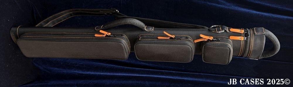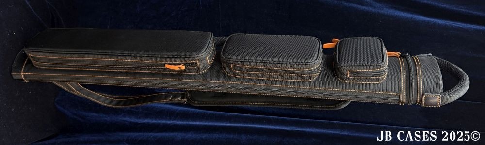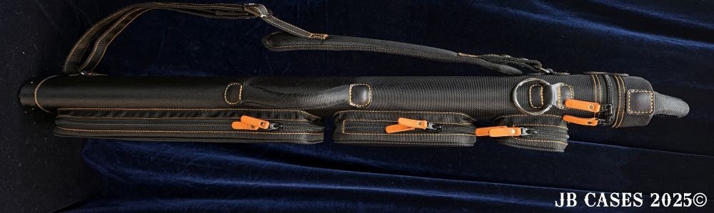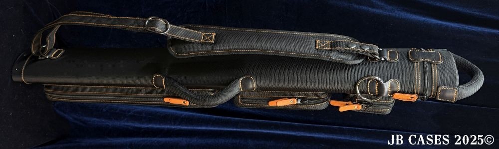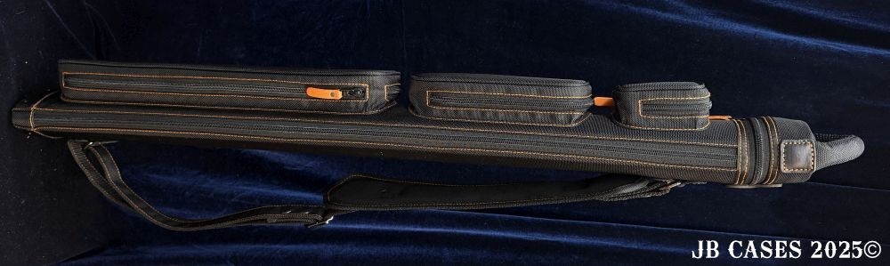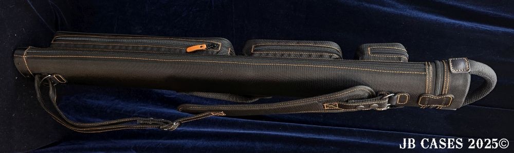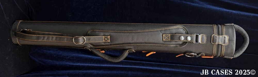 This case holds 2 butts and 3 shafts. Maximum interior length capacity is 32.5". This case is made of durable nylon/polyester material with reinforced leather stress points. Features an UltraPad interior and very comfortable handles. Has a heavy duty rubber bottom. Featuring a non-slip well padded shoulder strap. Zippers are the highest quality available and each zipper has two pulls in case one should break. Three roomy pockets for easy access to your essentials.