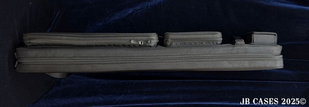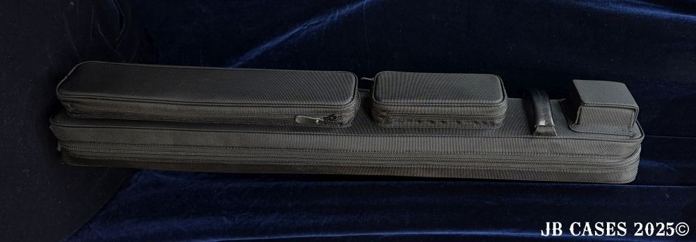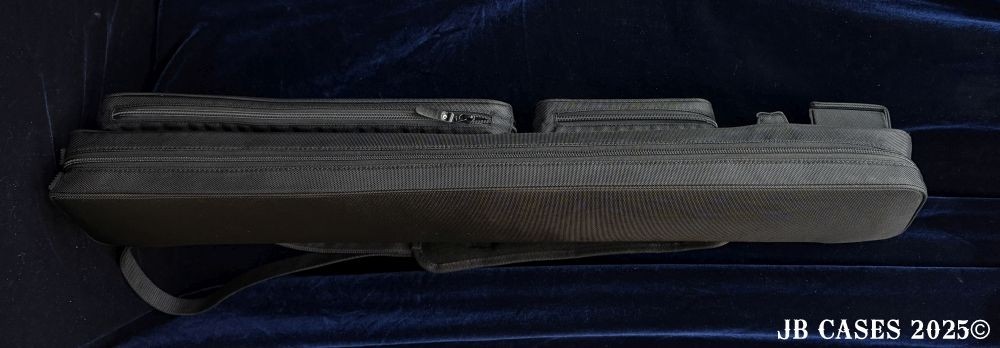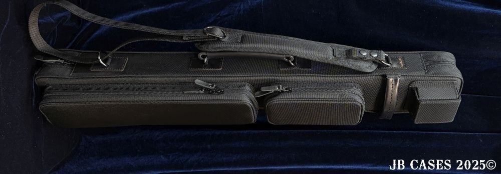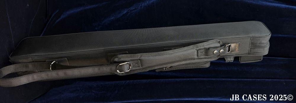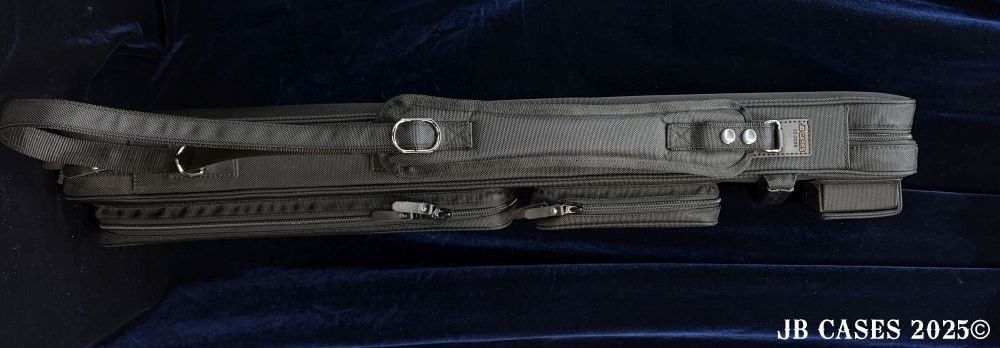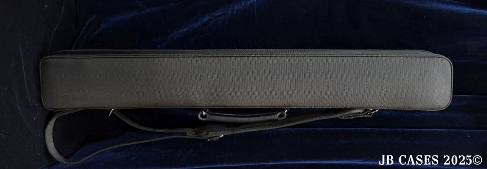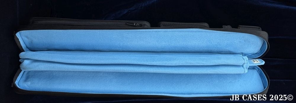 This case holds 2 butts and 4 shafts. Maximum interior length capacity is 32.5". This case is made of durable nylon/polyester material with reinforced leather stress points. Features an UltraPad interior and very comfortable handles. Featuring a non-slip well padded shoulder strap. Zippers are the highest quality available and each zipper has two pulls in case one should break. Three roomy pockets for easy access to your essentials. Magnetic Top Pocket. Single Side Strap. Light Blue Interior.