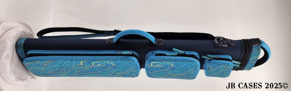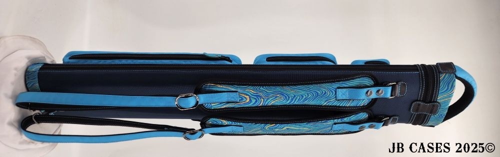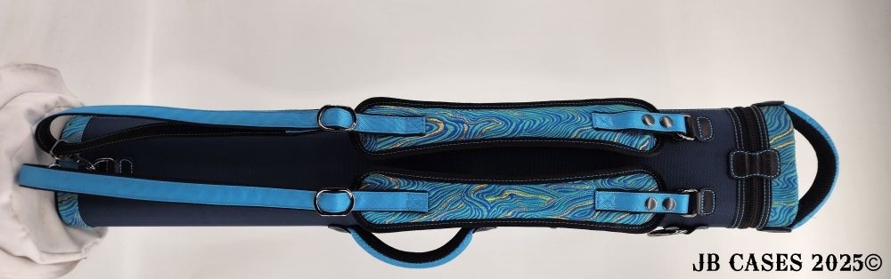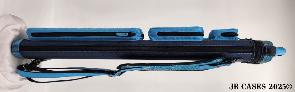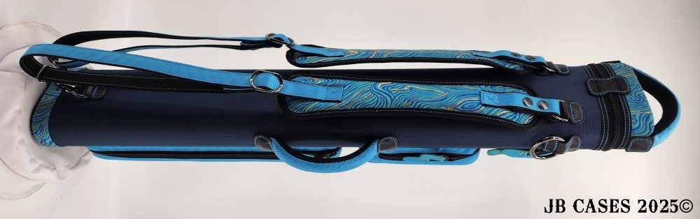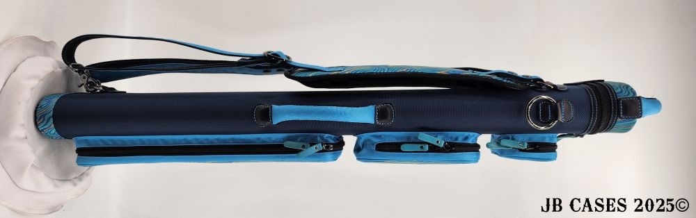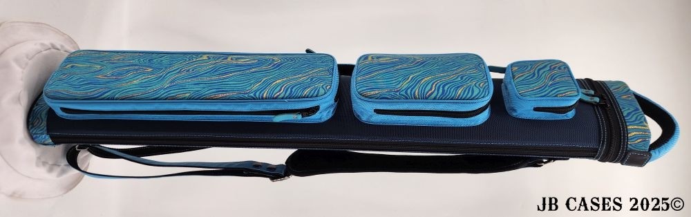 This rugged case holds up to 2 butts and 5 shafts or 3 butts and 4 shafts. Maximum interior length capacity is 32.5". This case is made of durable nylon and polyester, and Wave print pattern with Gold Metallic Accents. Distinctions and Features: -Teal interior -Reinforced leather stress points -UltraPad Interior -Ergonomic top and side handles -Non-slip padded shoulder strap(s) -3 spacious pockets for easy access to your essentials -Backpack strap setup -Towel ring included