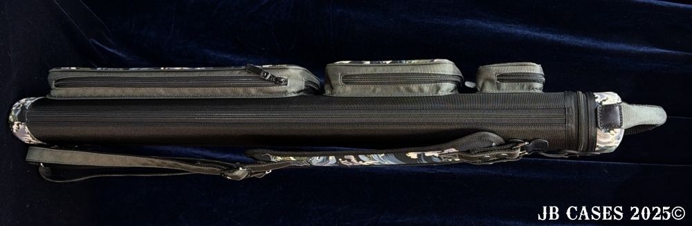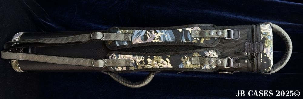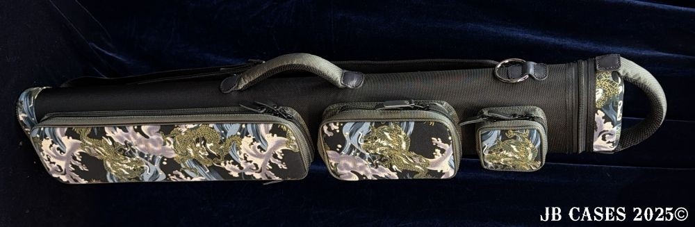 This rugged case holds up to 2 butts and 5 shafts OR 3 butts and 4 shafts. Maximum interior length capacity is 32.5". This case is made of durable nylon and polyester, and Shiny Gold Dragon Waves Print Fabric. Slate Gray Pocket Sides and Handles. Black Zipper Pulls.