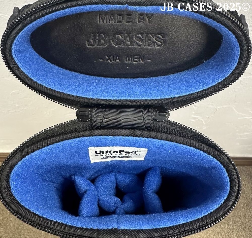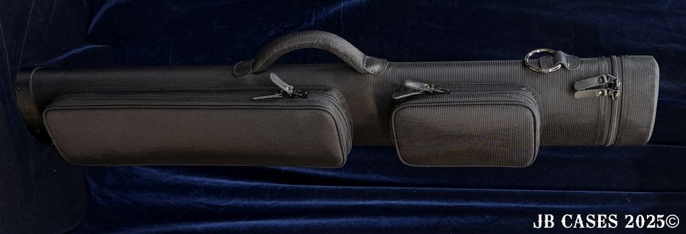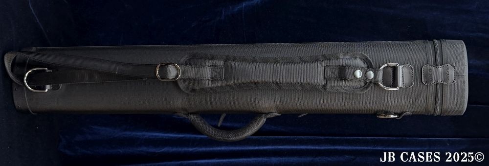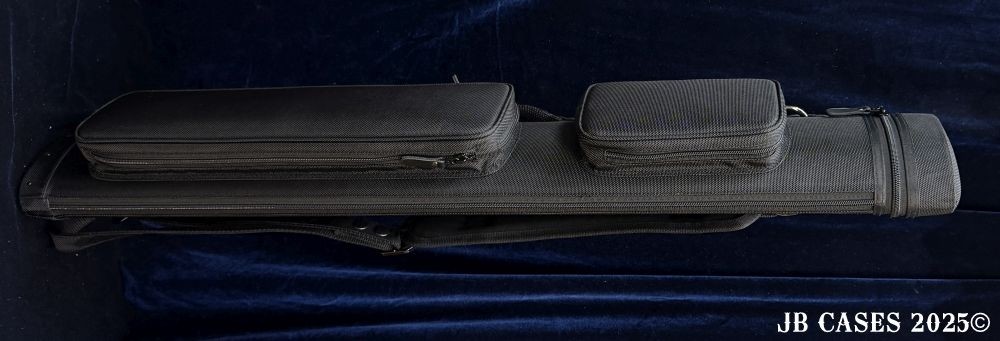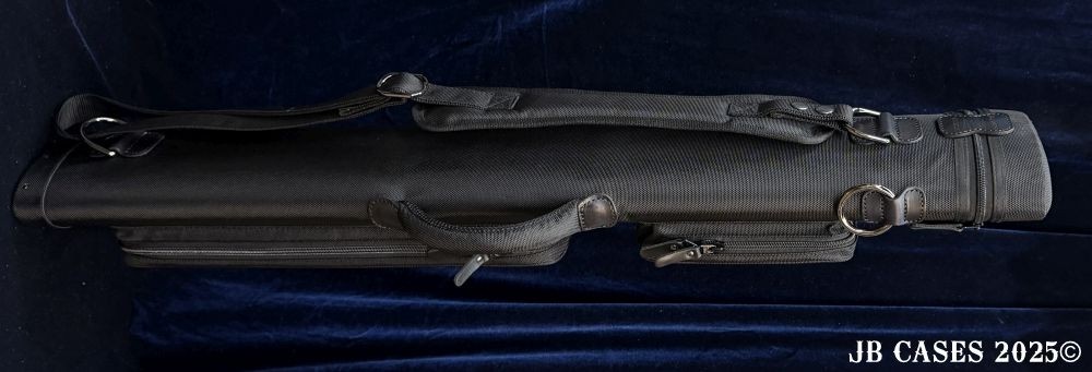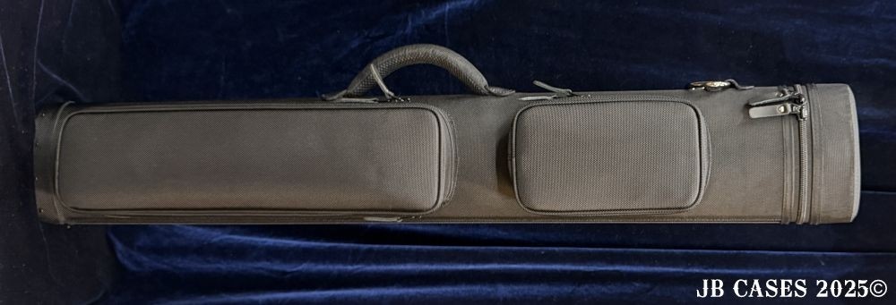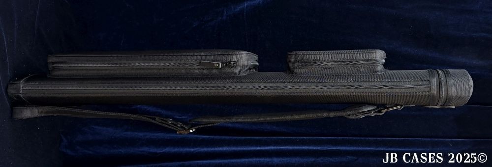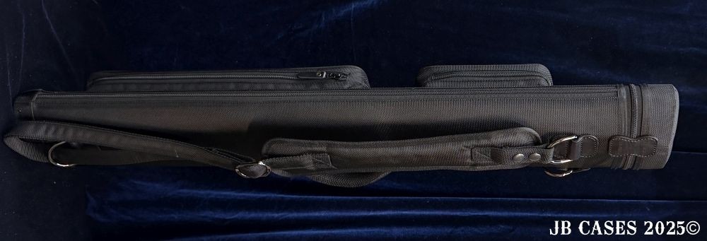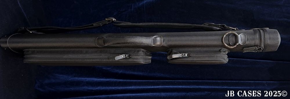 This case holds 2 butts and 5 shafts Or 3 butts and 4 shafts. Maximum interior length capacity is 32.5". This case is made of durable nylon/polyester material with reinforced leather stress points. Features an UltraPad interior and very comfortable handles. Has a heavy duty rubber bottom. Featuring a non-slip well padded shoulder strap. Zippers are the highest quality available and each zipper has two pulls in case one should break. Two roomy pockets for easy access to your essentials. All Black Case. Towel Ring and Single Strap.
