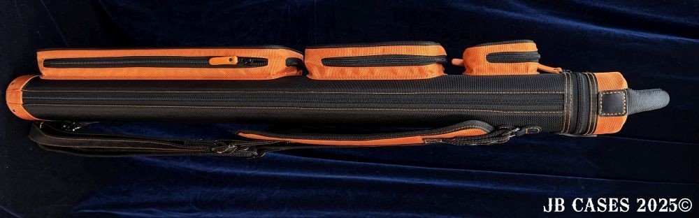 This case holds 2 butts and 5 shafts OR 3 butts and 4 shafts. Maximum interior length capacity is 32.5". This case is made of durable nylon/polyester material with reinforced leather stress points. Features an UltraPad interior, comfortable handles, a heavy duty rubber bottom, and a non-slip padded shoulder strap. Zippers are the highest quality available and each zipper has two pulls in case one should break. Three spacious pockets for easy access to your essentials, as well as backpack-style padded straps. Towel Ring. Black with Safety Orange Accents. Safety Orange Interior.