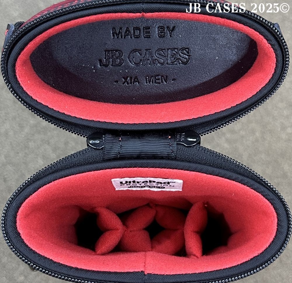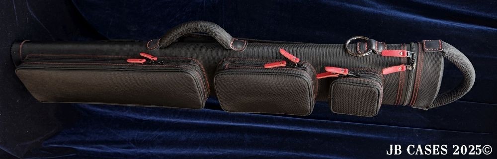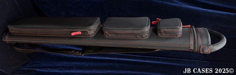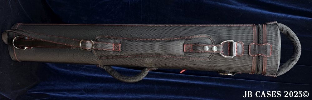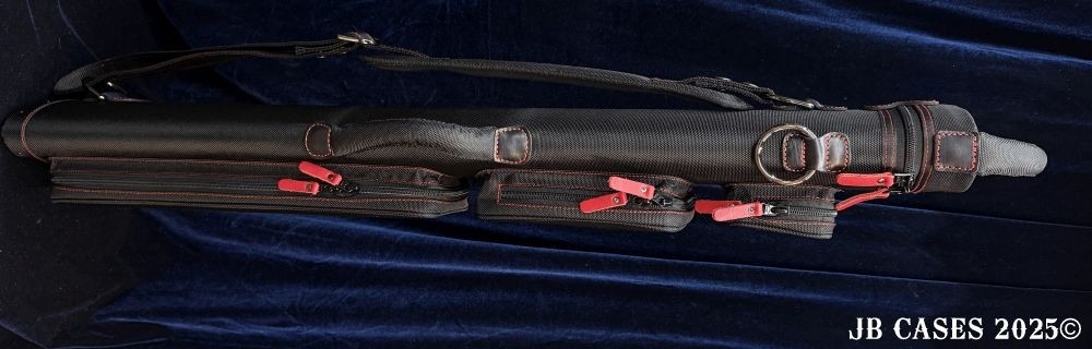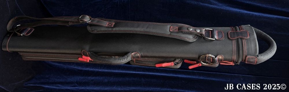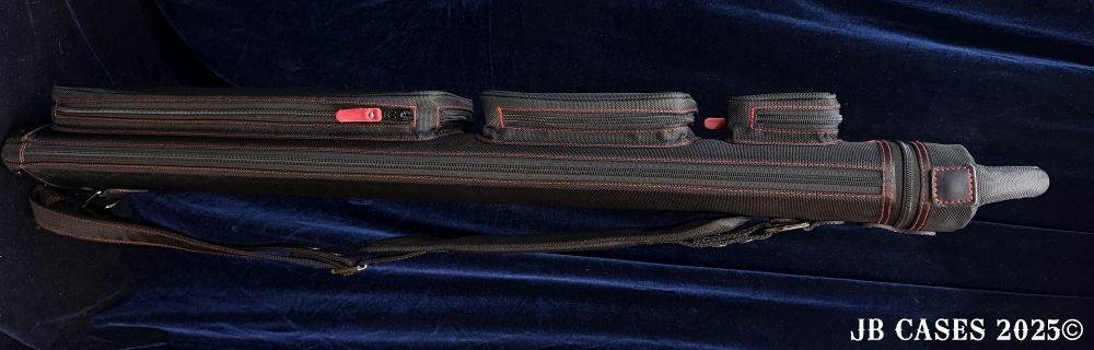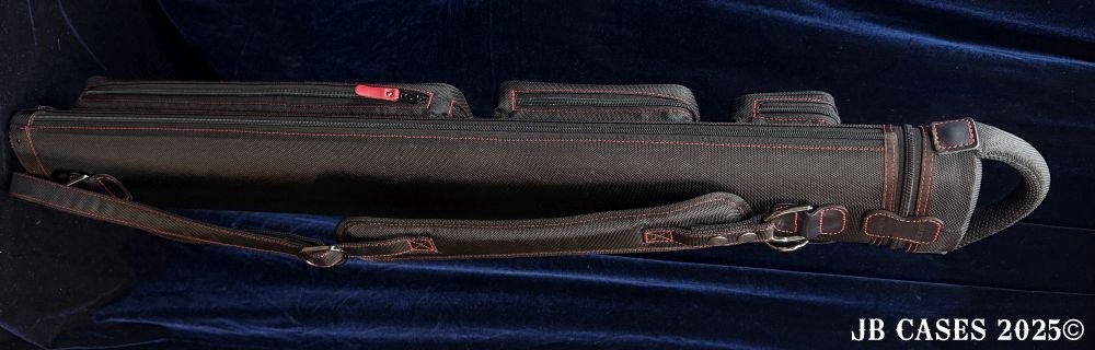 This case holds 2 butts and 5 shafts or 3 butts and 4 shafts. Maximum interior length capacity is 32.5". This case is made of durable nylon/polyester material with reinforced leather stress points. Features an UltraPad interior and very comfortable handles. Has a heavy duty rubber bottom. Featuring a non-slip well padded shoulder strap. Zippers are the highest quality available and each zipper has two pulls in case one should break. Three roomy pockets for easy access to your essentials. Red Interior, Single strap, and a towel ring.