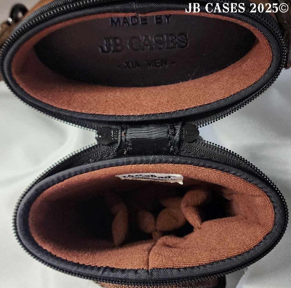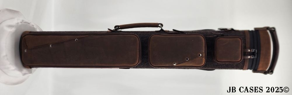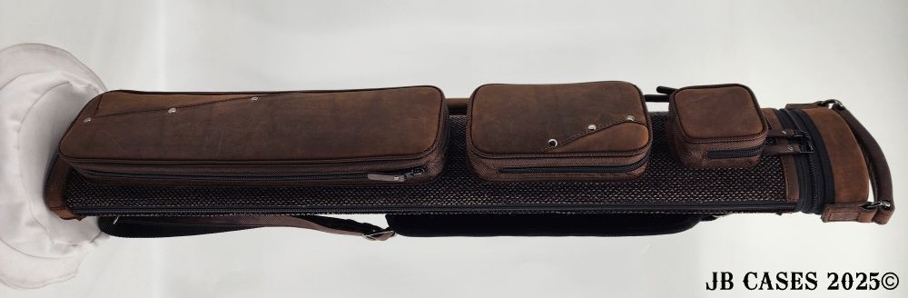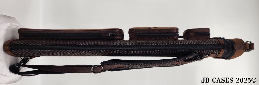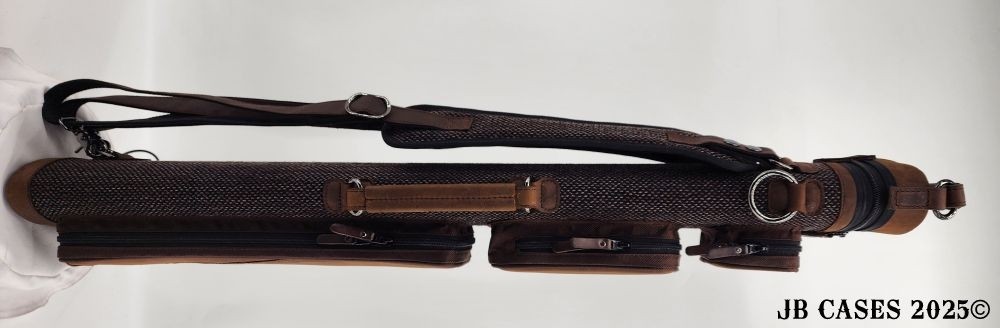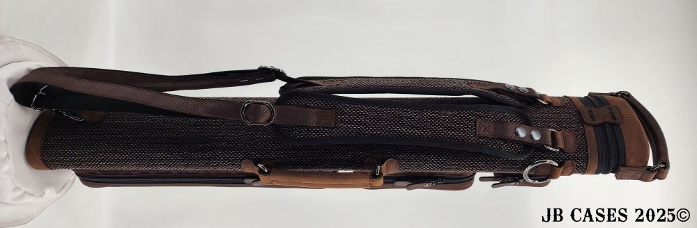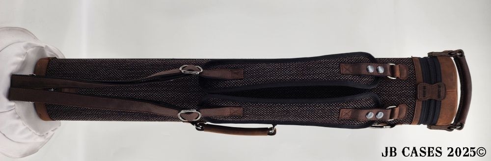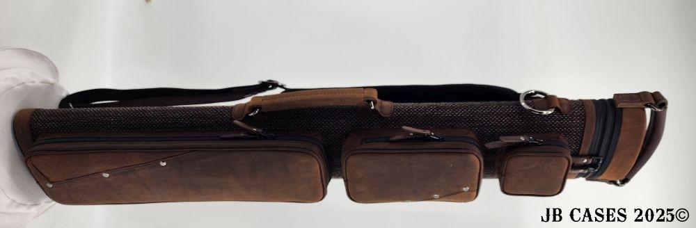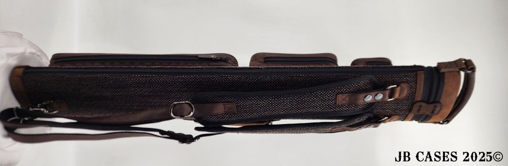 This case holds 2 butts and 5 shafts or 3 butts and 4 shafts. Maximum interior length capacity is 32.5". This case is made of durable leather and nylon/polyester material with reinforced leather stress points. Features an UltraPad interior and very comfortable handles. Has a heavy duty rubber bottom. Featuring a non-slip well padded shoulder strap. Zippers are the highest quality available and each zipper has two pulls in case one should break. Three roomy pockets for easy access to your essentials. Brown Tweed Body with Brown Leather Handles, Pocket, and Lid.