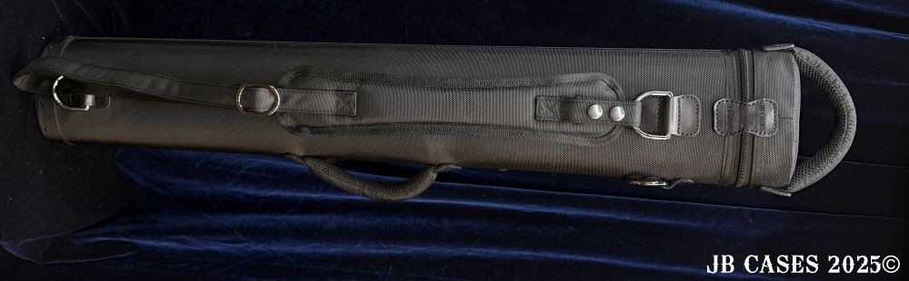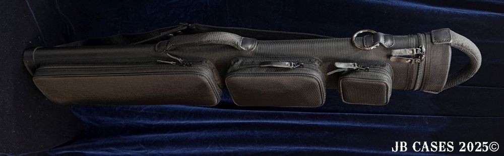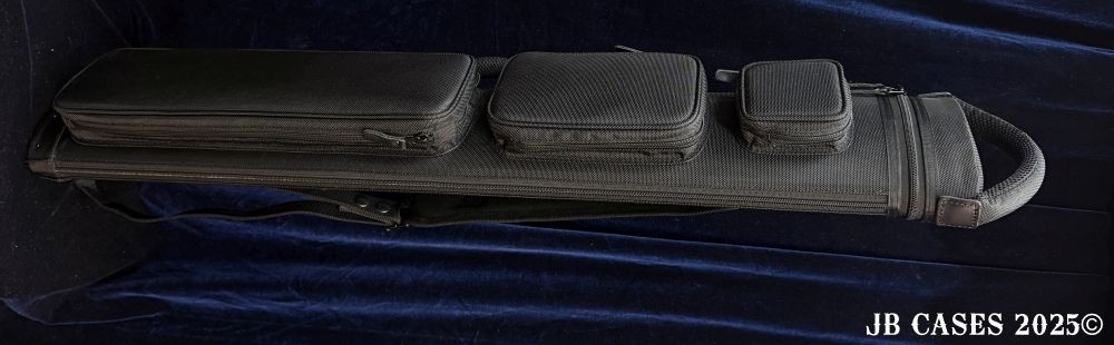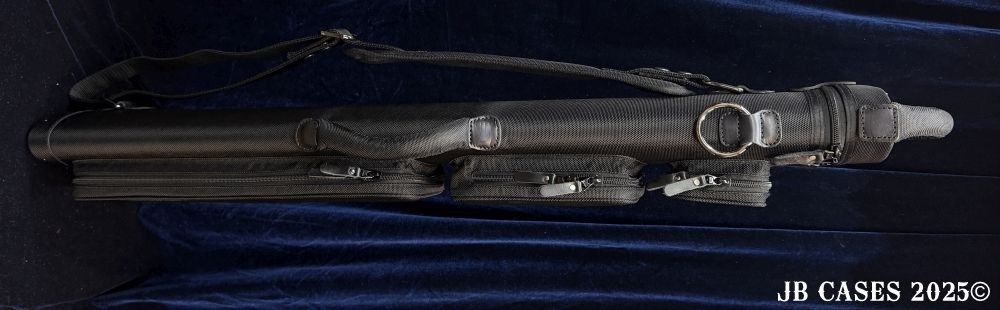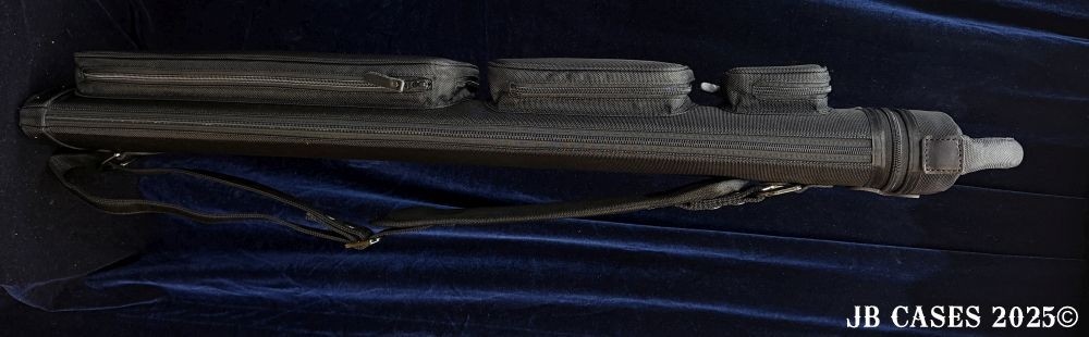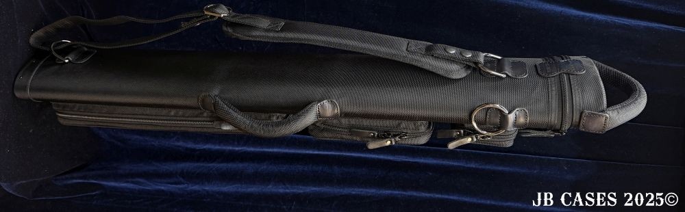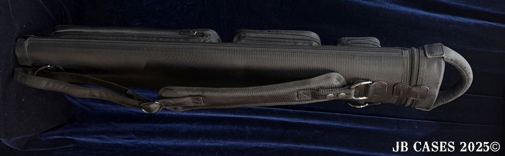 This case holds 2 butts and 5 shafts or 3 butts and 4 shafts. Maximum interior length capacity is 32.5". This case is made of durable nylon/polyester material with reinforced leather stress points. Features an UltraPad interior and very comfortable handles. Has a heavy duty rubber bottom. Featuring a non-slip well padded shoulder strap. Zippers are the highest quality available and each zipper has two pulls in case one should break. Three roomy pockets for easy access to your essentials. Blue Interior, Single strap, and a towel ring.