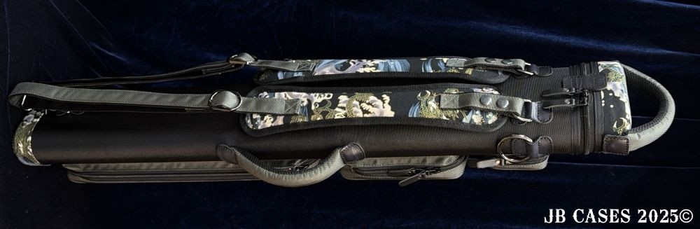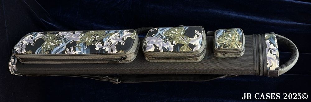 This rugged case holds up to 3 butts and 6 shafts. Maximum interior length capacity is 32.5". This case is made of durable nylon and polyester, and Shiny Gold Dragon Waves Print Fabric. Slate Gray Pocket Sides and Handles. Black Zipper Pulls.