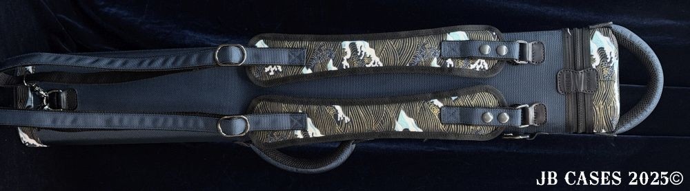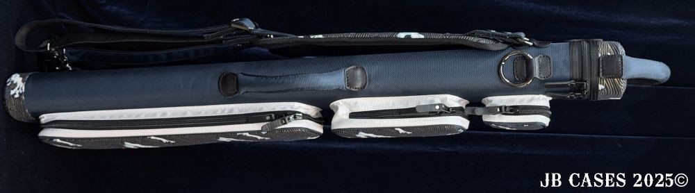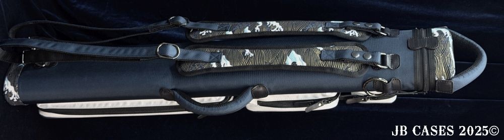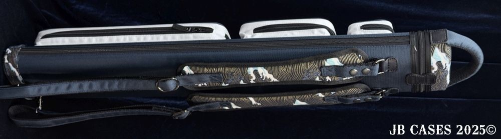 This rugged case holds up to 3 butts and 6 shafts. Maximum interior length capacity is 32.5". This case is made of durable nylon and polyester, and Metallic Gold Wave Print Fabric.