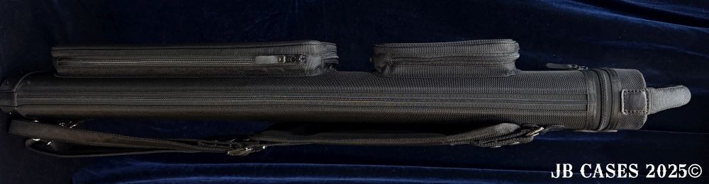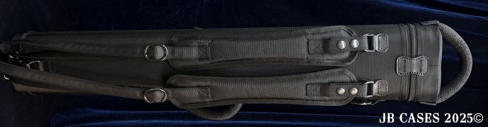 This case holds 3 butts and 6 shafts. Maximum interior length capacity is 32.5". This case is made of durable nylon/polyester material with reinforced leather stress points. Features an UltraPad interior and very comfortable handles. Has a heavy duty rubber bottom. Featuring a non-slip well padded shoulder strap.Zippers are the highest quality available and each zipper has two pulls in case one should break. Two roomy pockets for easy access to your essentials. Black, Blue Interior