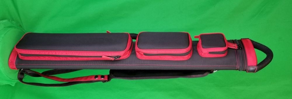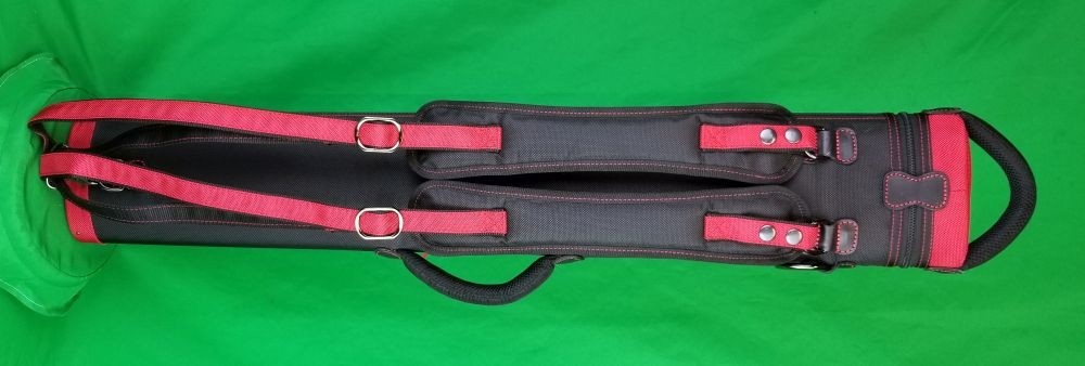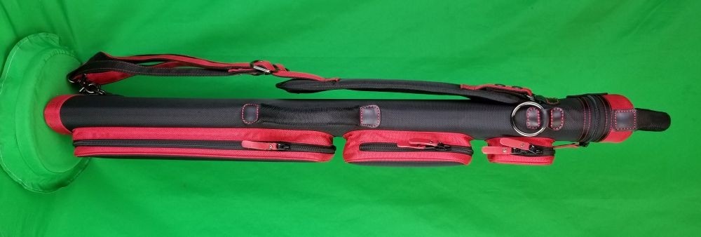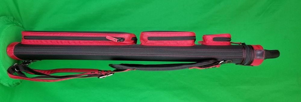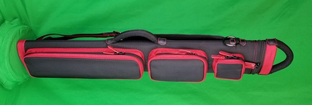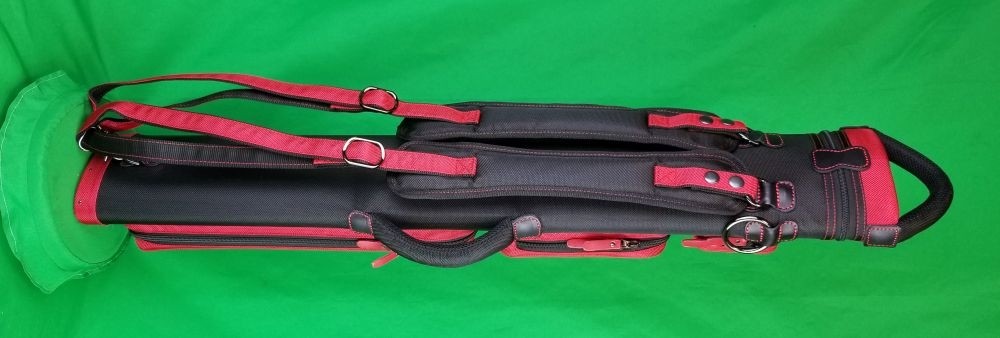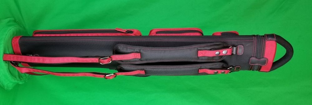 This case holds 3 butts and 6 shafts. Maximum interior length capacity is 32.5". This case is made of durable nylon/polyester material with reinforced leather stress points. Features an UltraPad interior, comfortable handles, a heavy duty rubber bottom, and a non-slip padded shoulder strap. Zippers are the highest quality available and each zipper has two pulls in case one should break. Three spacious pockets for easy access to your essentials, as well as backpack-style padded straps. Red interior. Towel Ring.