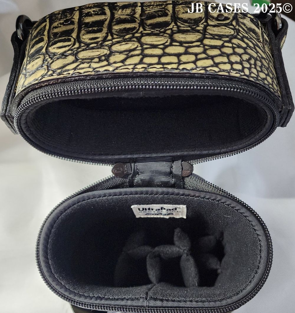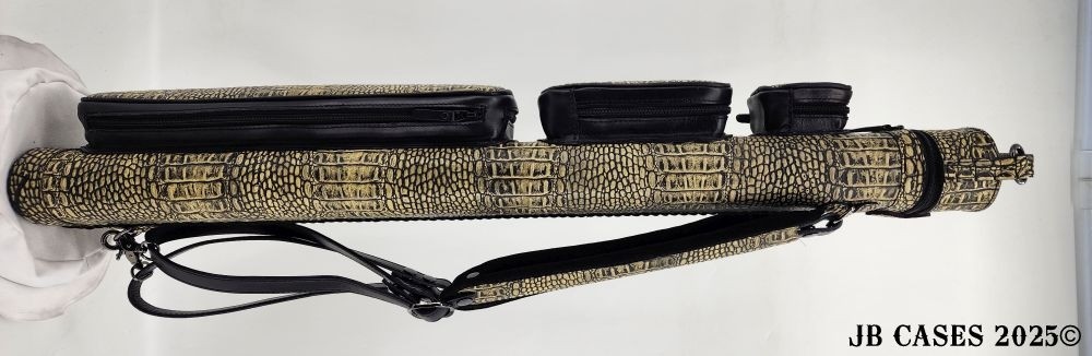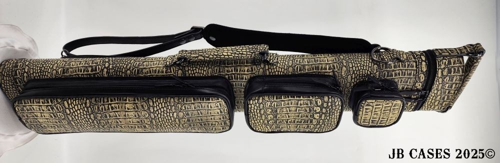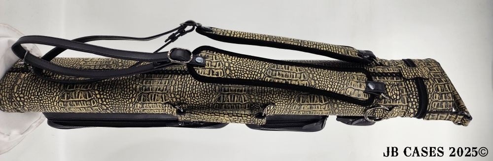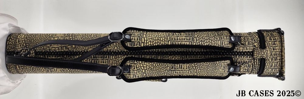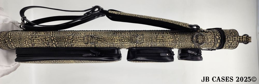 This beautiful light grey lizard print embossed cowhide leather case holds 3 butts and 6 shafts. Maximum interior length capacity is 31.5". This case is made of Gator Embossed Cowhide Leather with reinforced leather stress points and lacing on the back seam. Features an UltraPad interior and very comfortable handles. Featuring a non-slip well padded shoulder strap. Zippers are the highest quality available and each zipper has two pulls in case one should break. Three roomy pockets for easy access to your essentials. Comes with backpack straps.