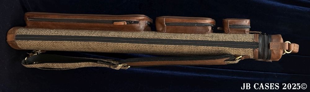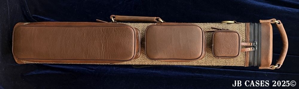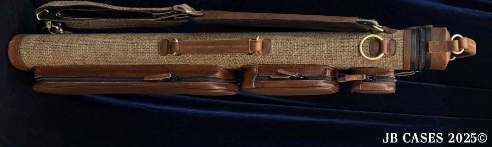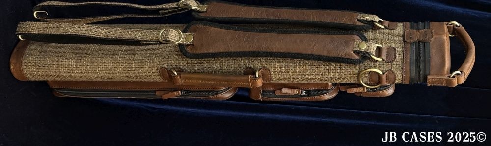 This case holds 3 butts and 6 shafts. Maximum interior length capacity is 32.5". This case is made of durable leather and nylon/polyester material with reinforced leather stress points. Features an UltraPad interior and very comfortable handles. Has a heavy duty rubber bottom. Featuring a non-slip well padded shoulder strap. Zippers are the highest quality available and each zipper has two pulls in case one should break. Three roomy pockets for easy access to your essentials. Brown Tweed Body with Brown Oil Tan Leather Handles, Pockets, Strap Pads, and Lid.