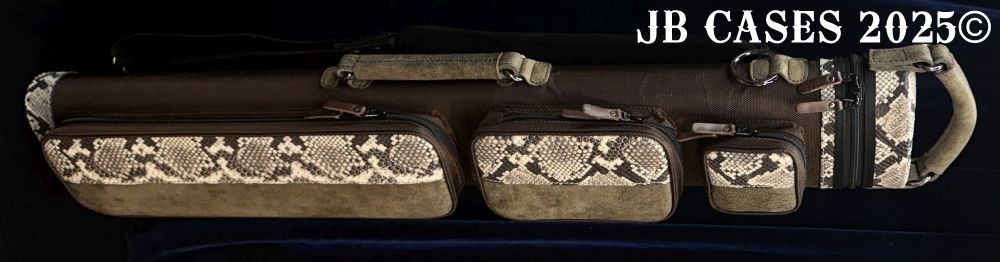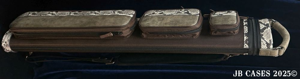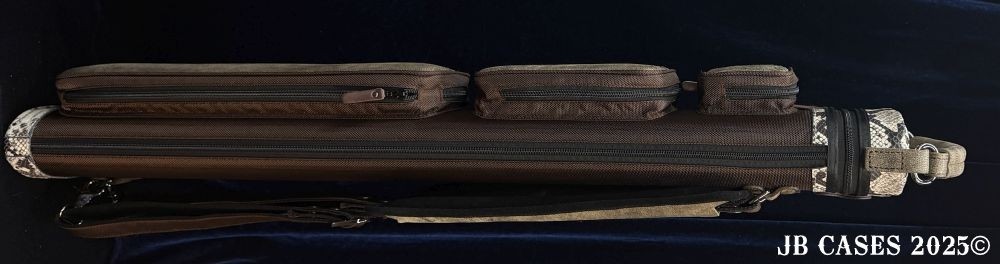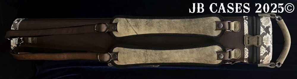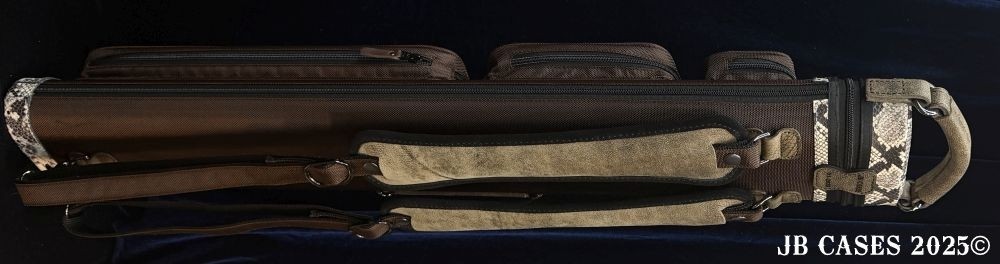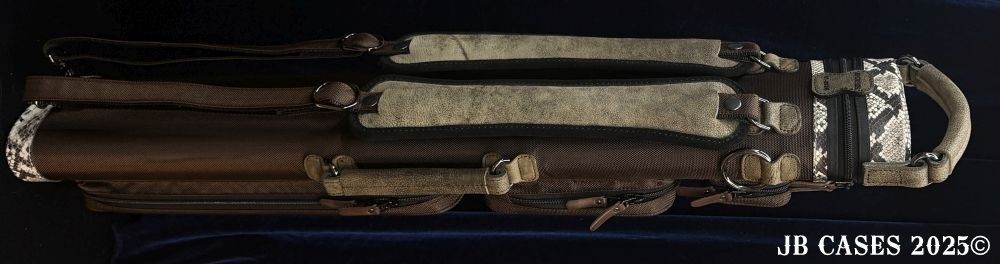 This rugged case holds up to 3 butts and 6 shafts. Maximum interior length capacity is 32.5". This case is a combination of embossed cowhide leather and durable nylon and polyester. Brown Nylon Case Body. Distinctions and Features: -Brown interior -Reinforced leather stress points -UltraPad Interior -Ergonomic top and side handles -Non-slip padded shoulder strap(s) -3 spacious pockets for easy access to your essentials -Backpack Straps -Towel Ring