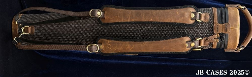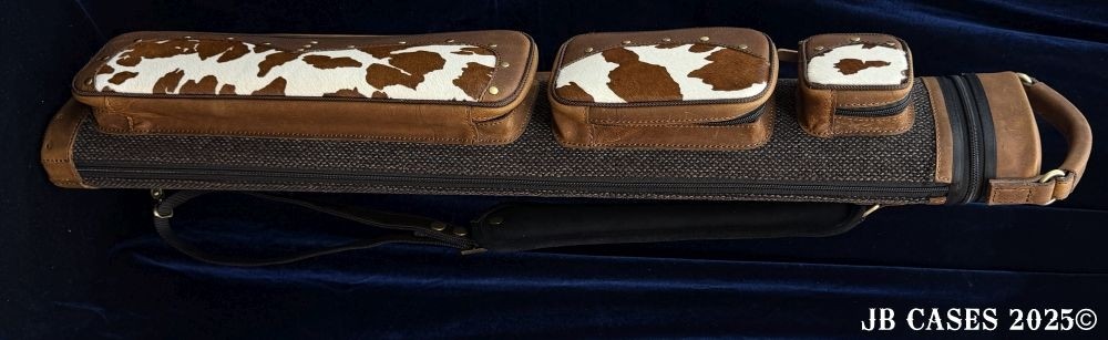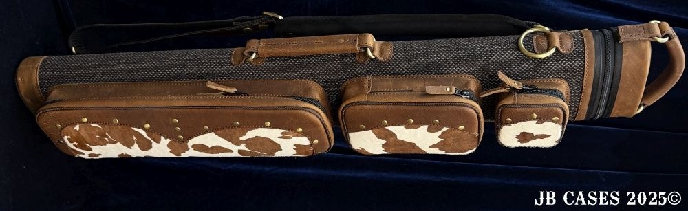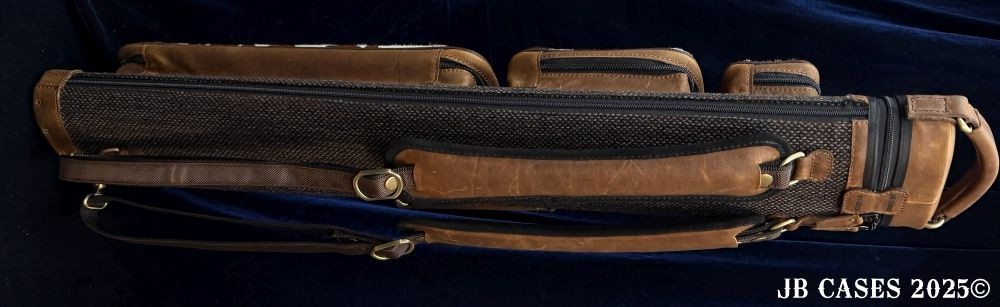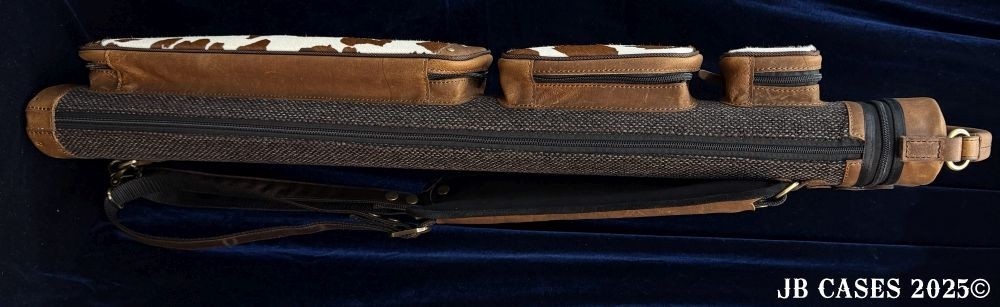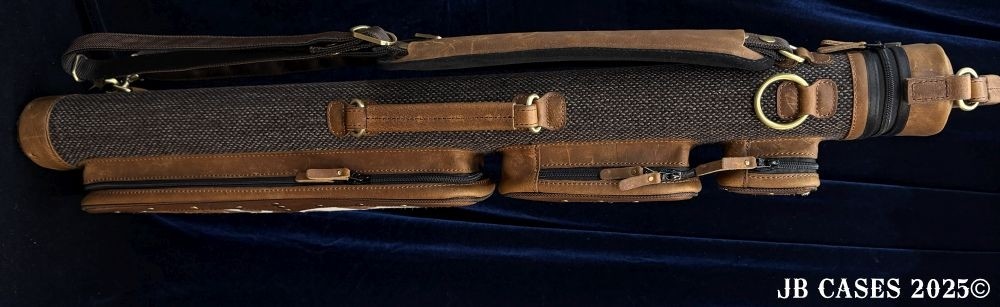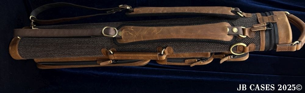 This rugged case holds up to 3 butts and 6 shafts. Maximum interior length capacity is 32.5". This case is a combination of cowhide leather with the body of the case in brown tweed. Featuring brown leather pieces attached to the pocket faces with brass rivets.