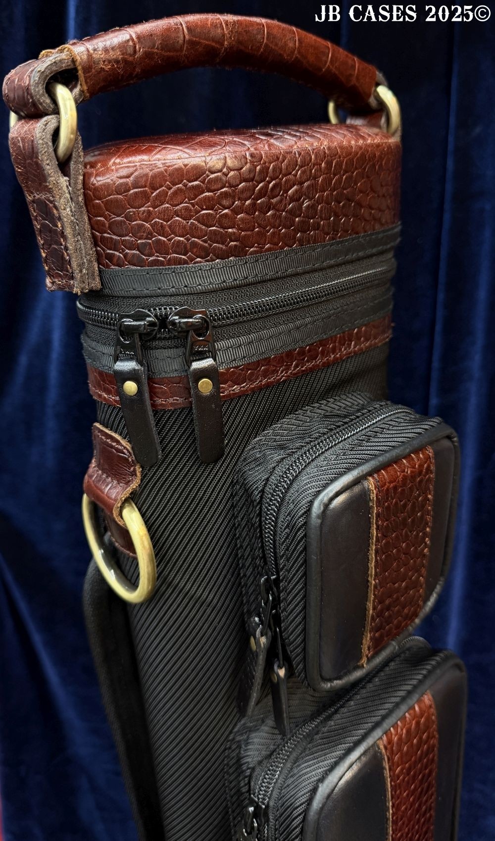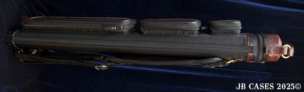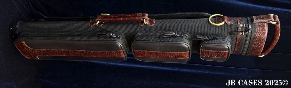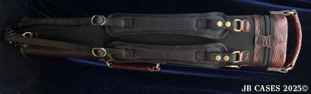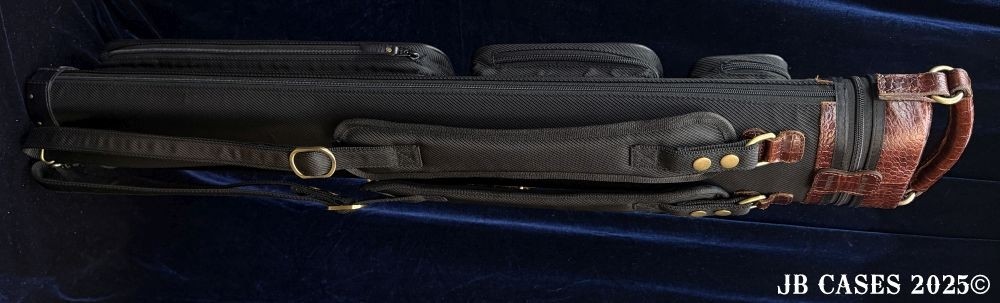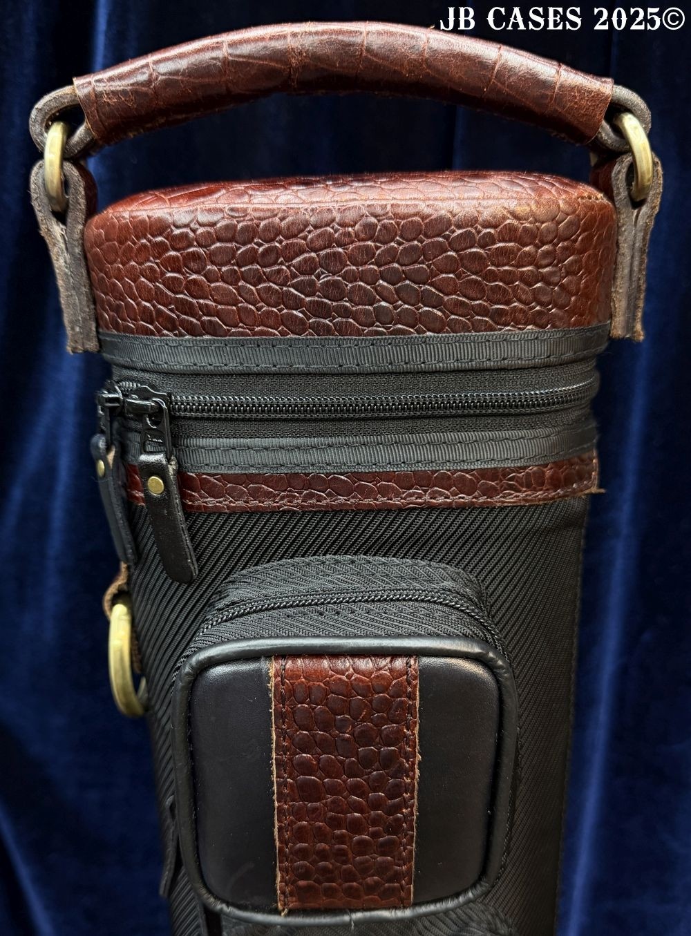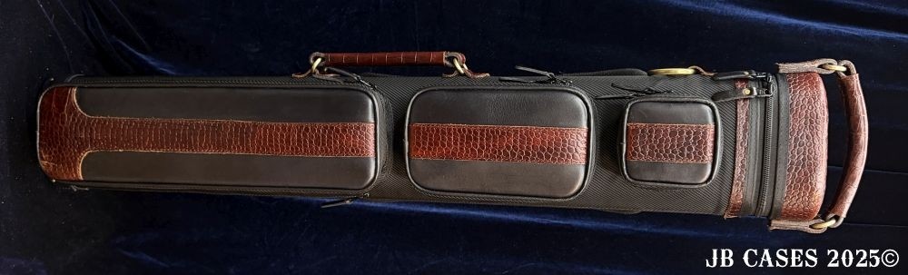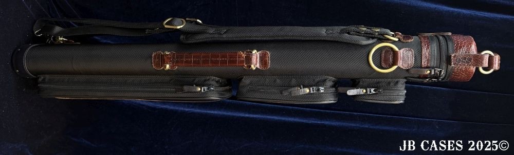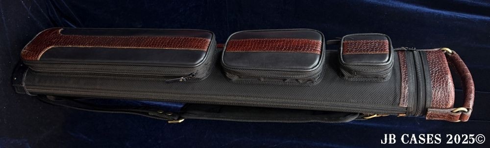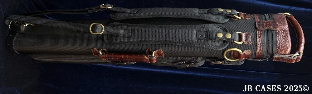 This rugged case holds up to 3 butts and 6 shafts. Maximum interior length capacity is 32.5". This case is a combination of gator print embossing cowhide leather and durable carbon fiber texture nylon and polyester.