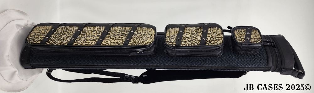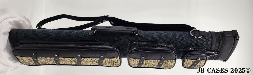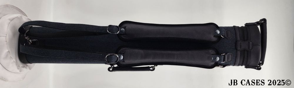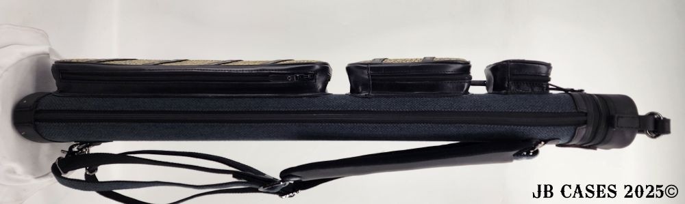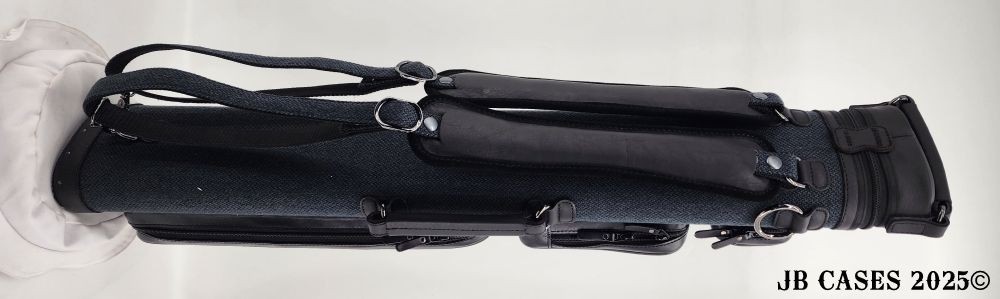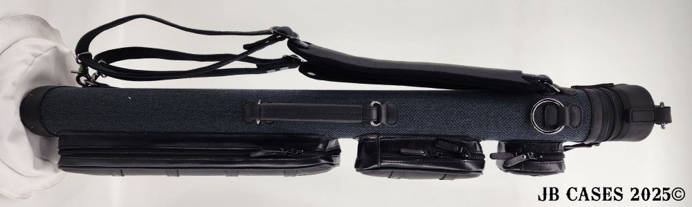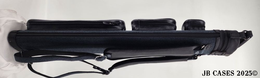 This rugged case holds up to 3 butts and 6 shafts. Maximum interior length capacity is 32.5". This case is a combination of embossed cowhide leather and durable nylon and polyester, with the body of the case in navy blue tweed. Distinctions and Features: -Blue interior -Reinforced leather stress points -UltraPad Interior -Ergonomic top and side handles -Non-slip padded shoulder strap(s) -3 spacious pockets for easy access to your essentials -Backpack Straps -Towel Ring