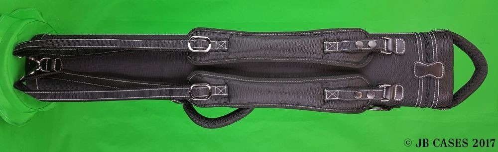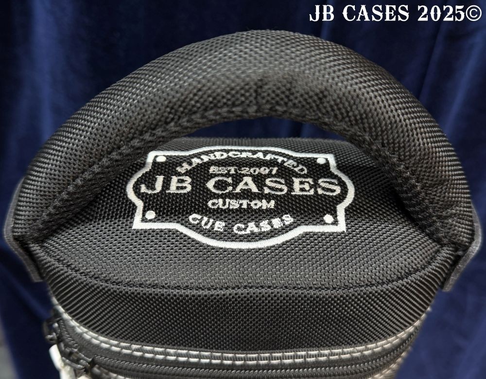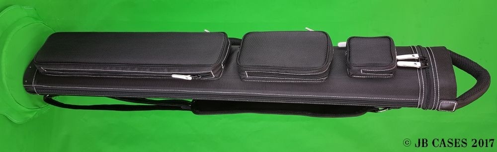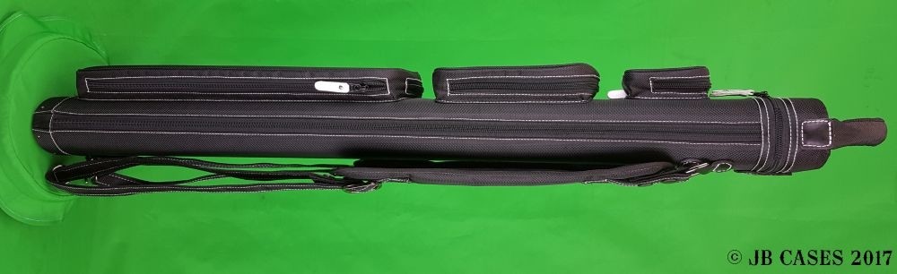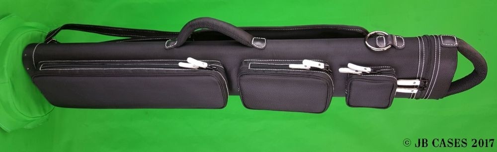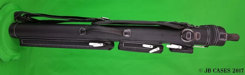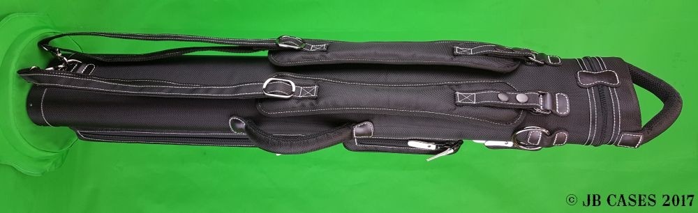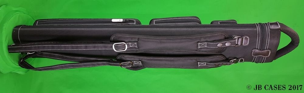 This case holds 3 butts and 6 shafts. Maximum interior length capacity is 32.5". This case is made of durable nylon/polyester material with reinforced leather stress points. Features an UltraPad interior and very comfortable handles. Has a heavy-duty rubber bottom, featuring a non-slip well-padded suede leather shoulder strap. Zippers are the highest quality available and each zipper has two pulls in case one should break. Three roomy pockets for easy access to your essentials. White stitching, White Zipper Pulls, Towel Ring, Backpack straps. White Rivet Logo on Top of Lid. Slate Gray Interior.
