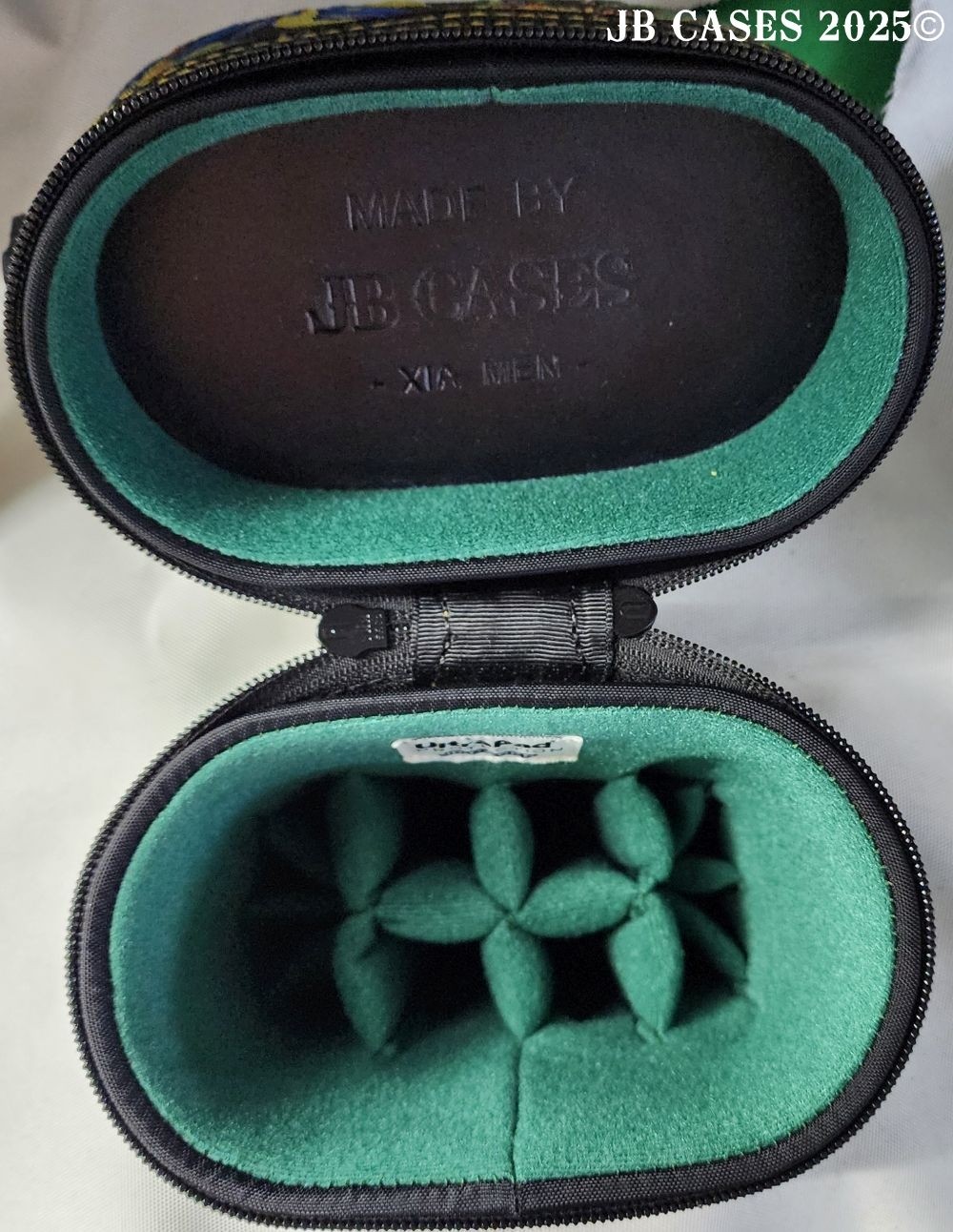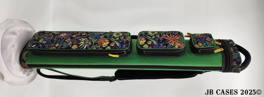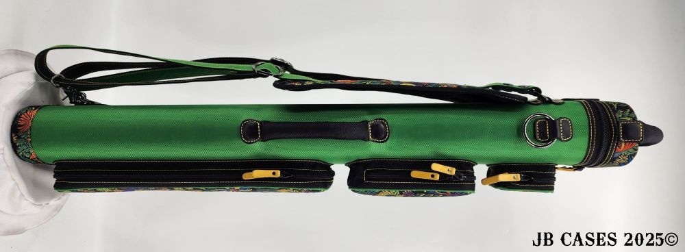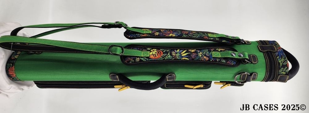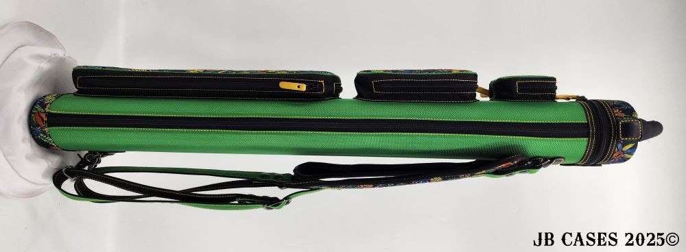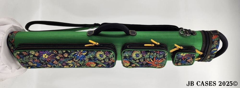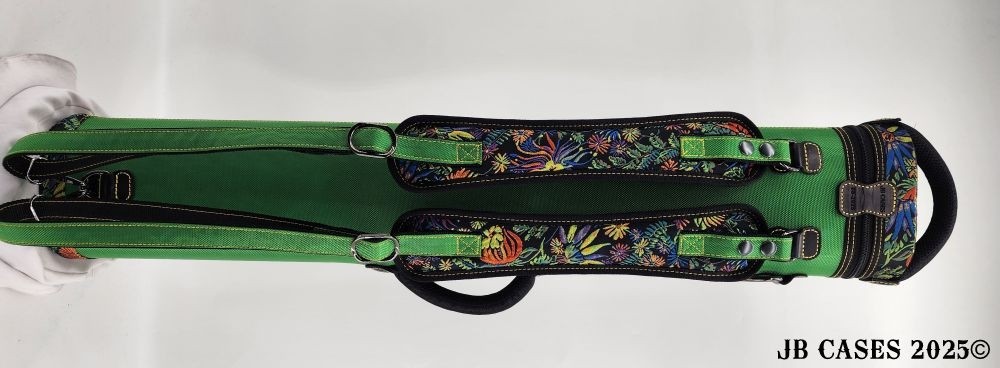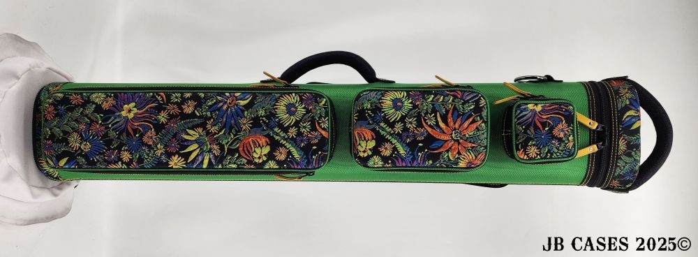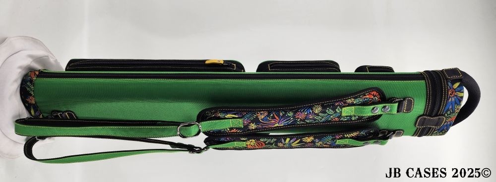 This case holds 4 butts and 8 shafts. Maximum interior length capacity is 32.5". This case is made of durable nylon/polyester material with reinforced leather stress points. Features an UltraPad interior and very comfortable handles. Has a heavy duty rubber bottom. Featuring non-slip well padded backpack straps. Zippers are the highest quality available and each zipper has two pulls in case one should break. Three roomy pockets for easy access to your essentials. Towel Ring. This Ultimate Rugged case is made with Floral Pattern Fabric accents. Kelly Green Body and Piping. Black Handles and Pocket Sides. Yellow Zipper Pulls and Stitching. Dark Green Interior.