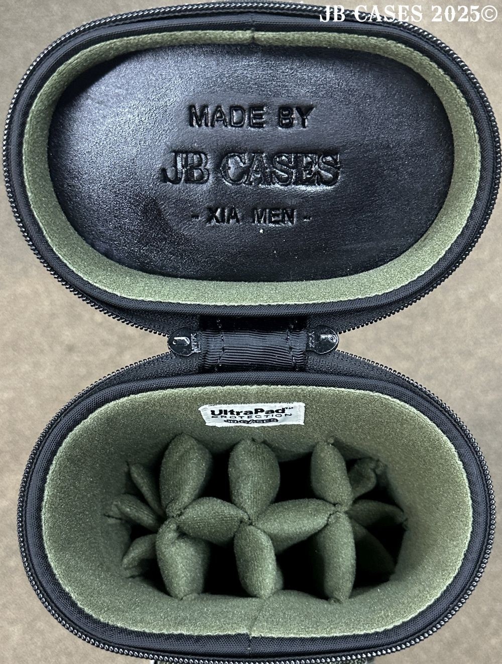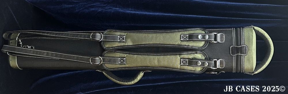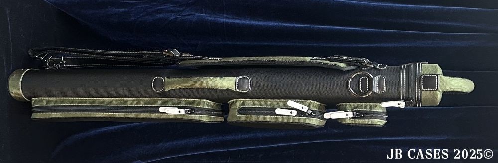 This case holds 4 butts and 8 shafts. Maximum interior length capacity is 32.5". This case is made of durable nylon/polyester material with reinforced leather stress points. Features an UltraPad interior, comfortable handles, a heavy duty rubber bottom, and non-slip padded Backpack straps. Towel Ring. Army Green Interior.