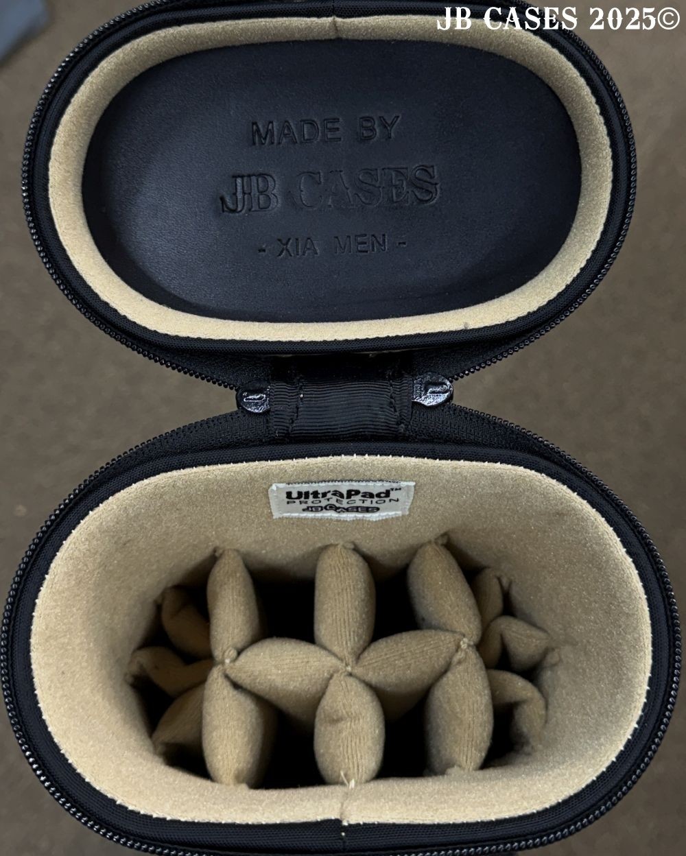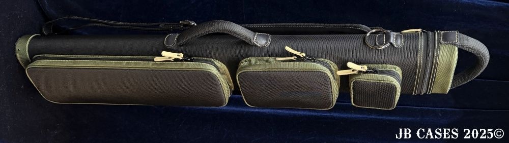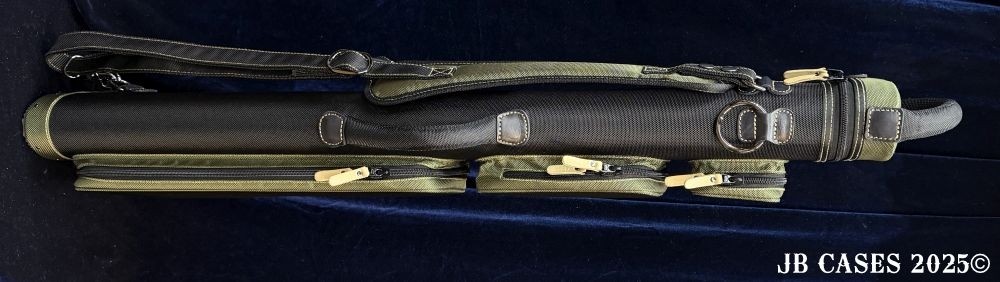 This case holds 4 butts and 8 shafts. Maximum interior length capacity is 32.5". This case is made of durable nylon/polyester material with reinforced leather stress points. Features an UltraPad interior, comfortable handles, a heavy duty rubber bottom, and non-slip padded Backpack straps. Towel Ring. Tan Interior.