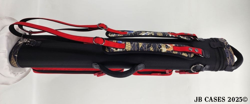 This rugged case holds up to 4 butts and 8 shafts. Maximum interior length capacity is 32.5". This case is made of durable nylon and polyester, and Shiny Golden Koi Print Fabric. Distinctions and Features: -Red interior -Reinforced leather stress points -UltraPad Interior -Ergonomic top and side handles -Non-slip padded shoulder strap(s) -3 spacious pockets for easy access to your essentials -Backpack strap setup -Towel ring included
