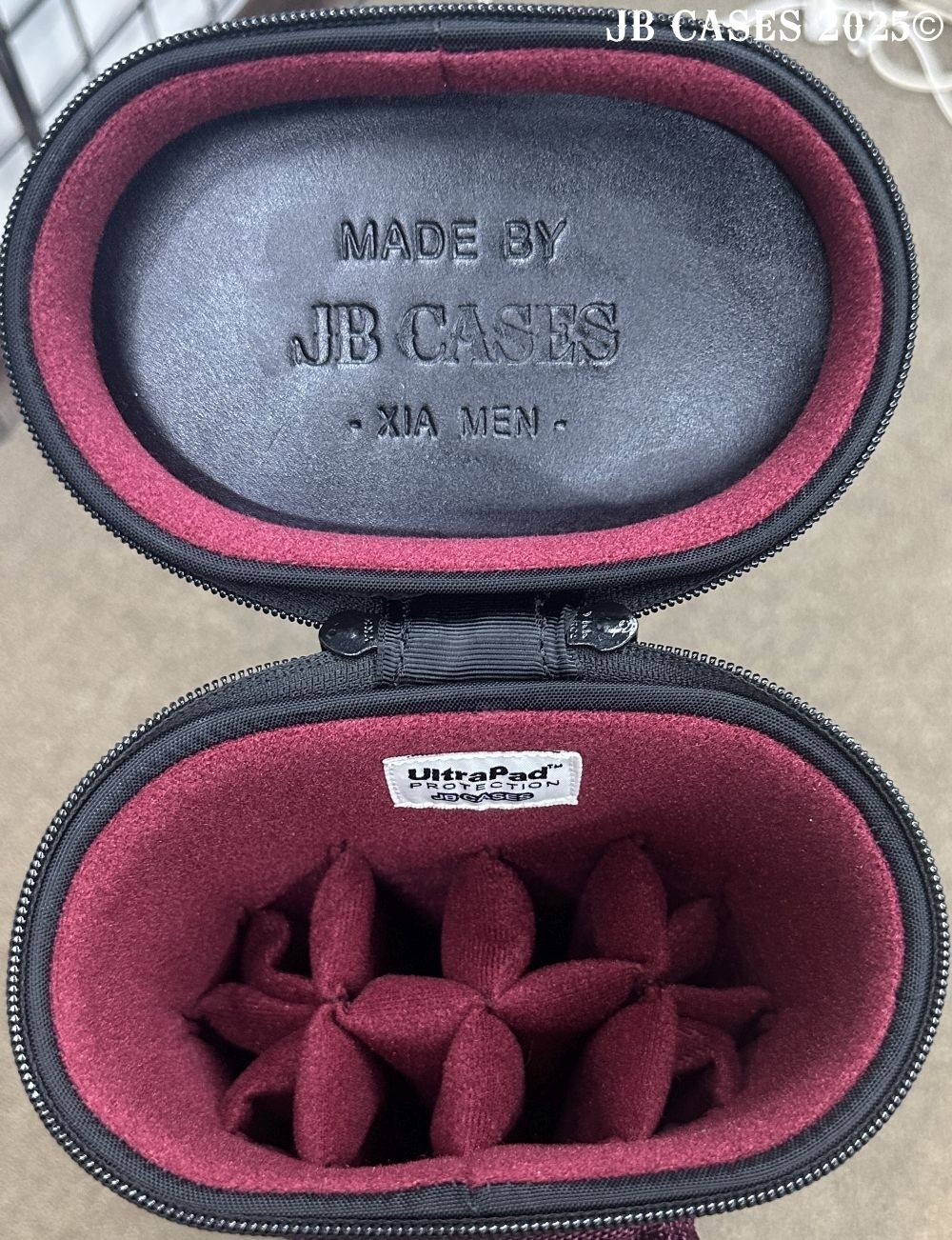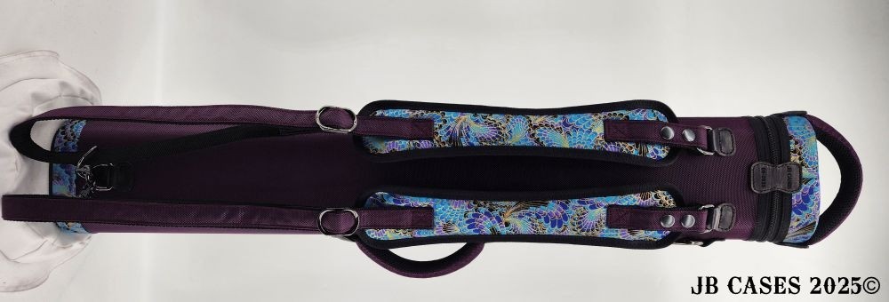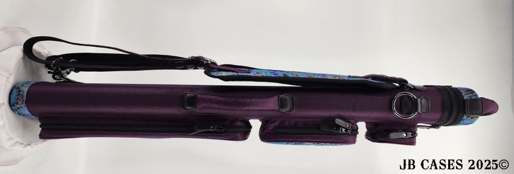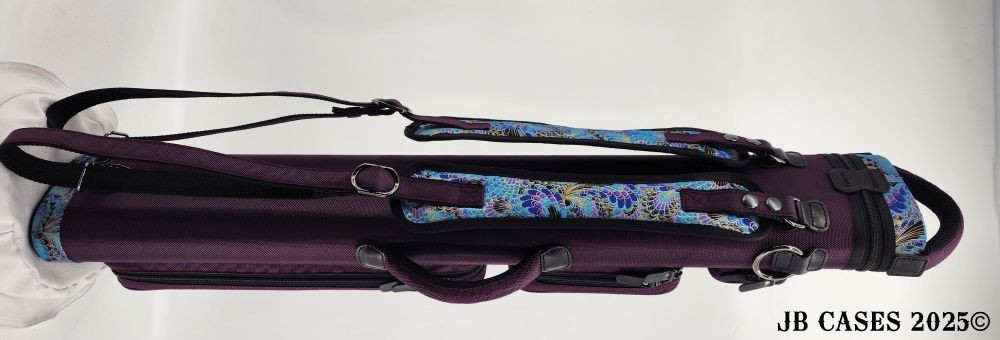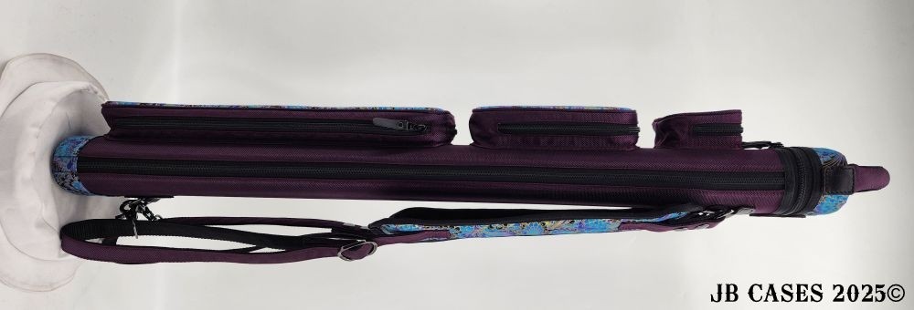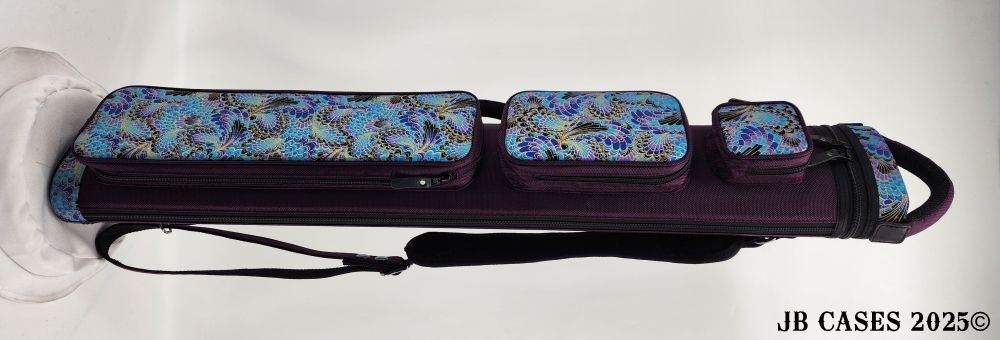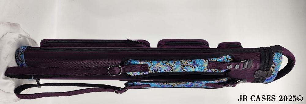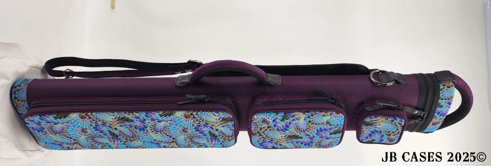 This rugged case holds up to 4 butts and 8 shafts. Maximum interior length capacity is 32.5". This case is made of durable nylon and polyester, and Shiny Gold, Teal, and Purple Peacock Print Fabric. Maroon Case Body, Handles, and Pocket Sides