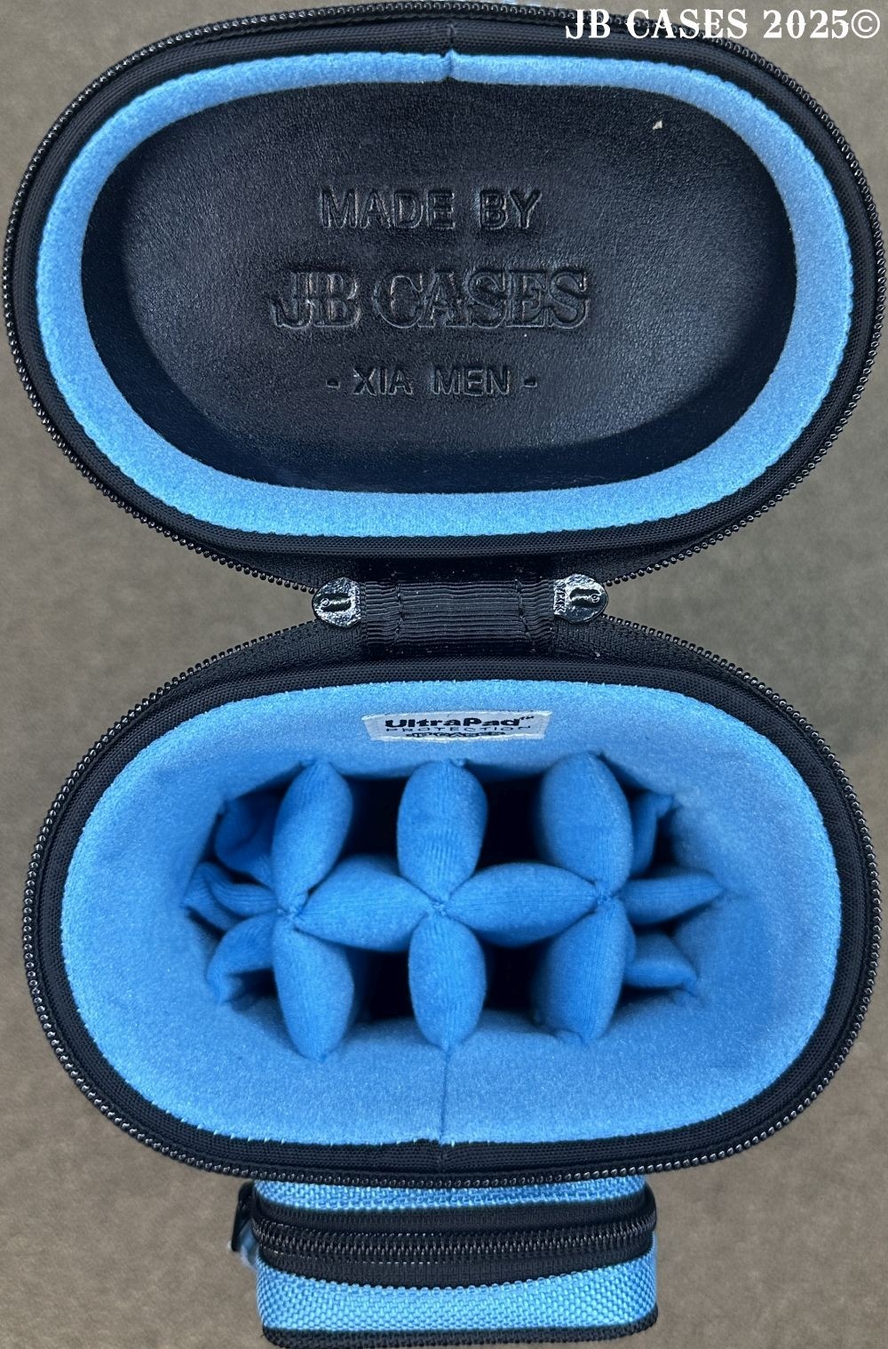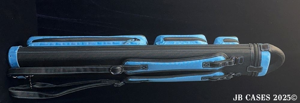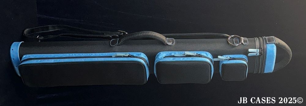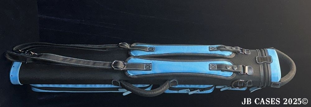 This case holds 4 butts and 8 shafts. Maximum interior length capacity is 32.5". This case is made of durable nylon/polyester material with reinforced leather stress points. Features an UltraPad interior, comfortable handles, a heavy duty rubber bottom, and a non-slip padded shoulder strap. Zippers are the highest quality available and each zipper has two pulls in case one should break. Three spacious pockets for easy access to your essentials, as well as backpack-style padded straps. Towel Ring. Black with Teal Accents. Teal Interior.