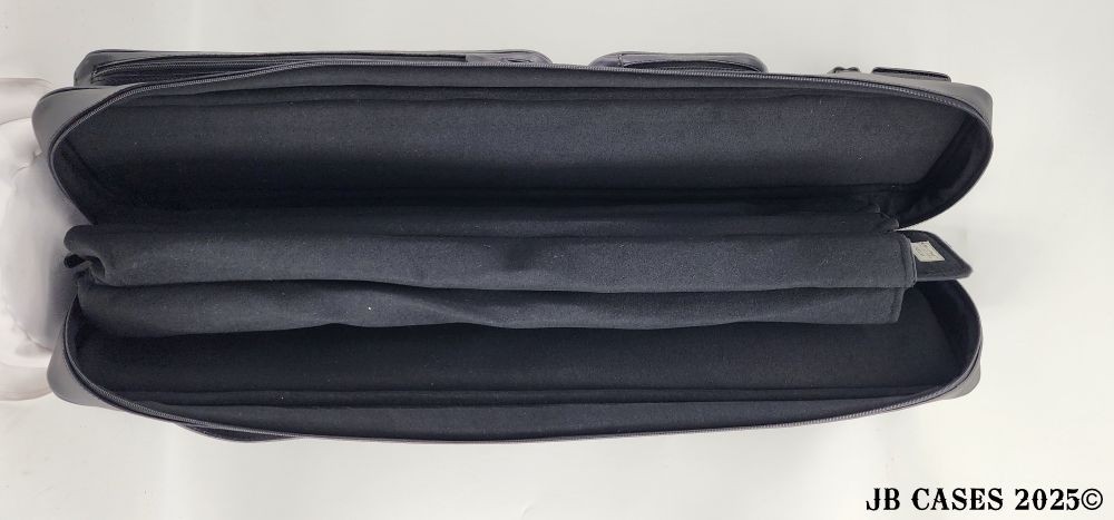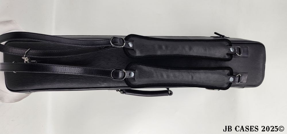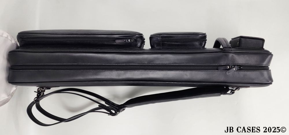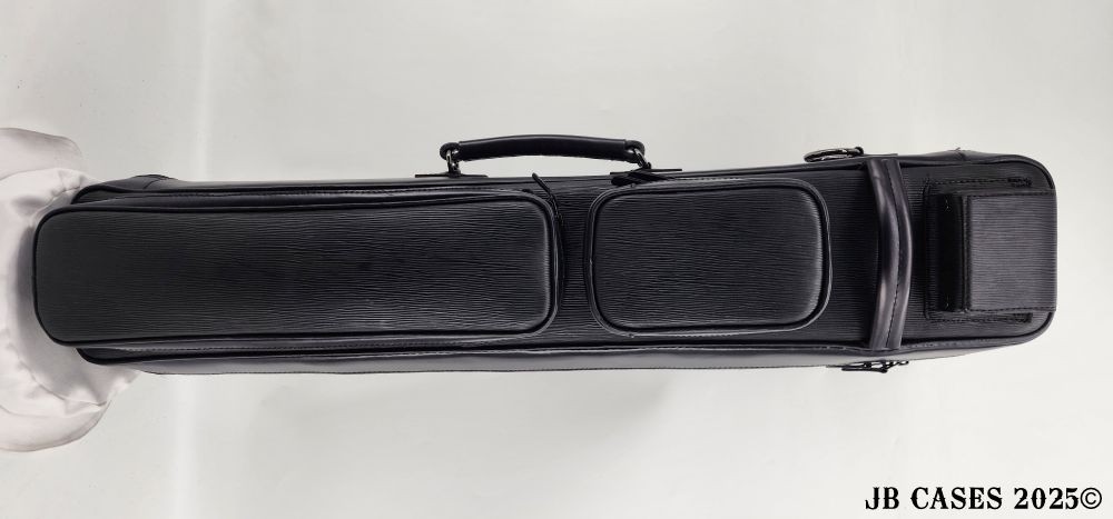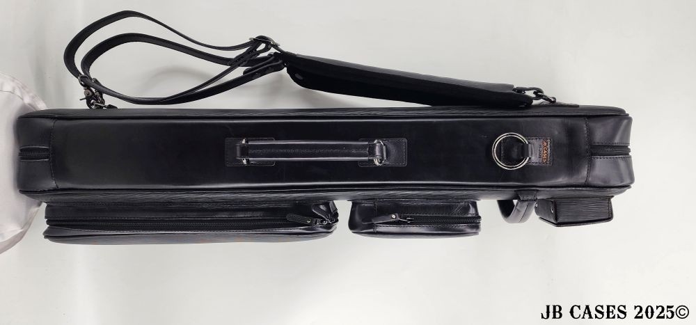 This case holds 4 butts and 8 shafts. Maximum interior length capacity is 32.5". This case is made of a Black Linear Textured Embossing Veg/tan and Saddle Leather with reinforced stress points. Features an UltraPad interior and very comfortable handles. Featuring a non-slip well padded shoulder strap. Zippers are the highest quality available and each zipper has two pulls in case one should break. Three roomy pockets for easy access to your essentials.