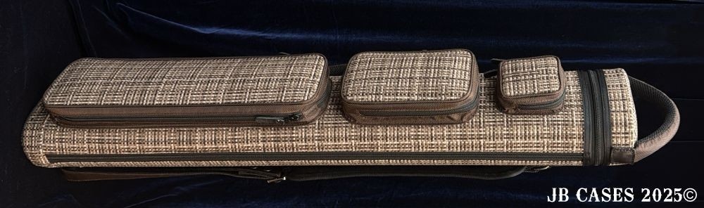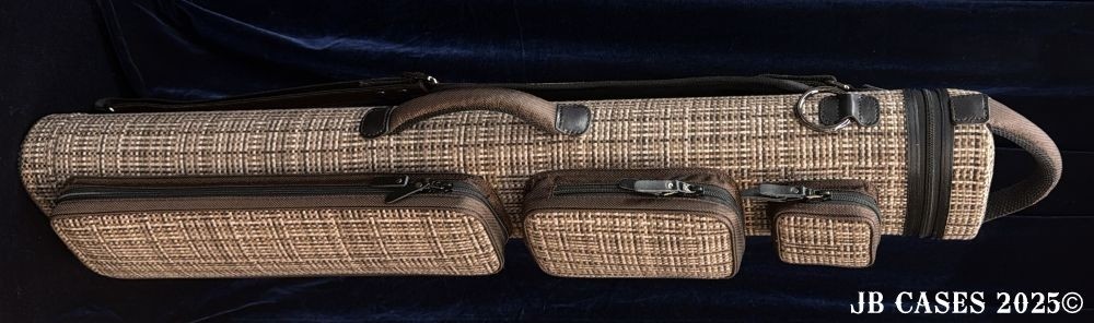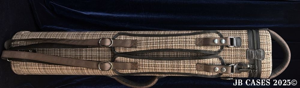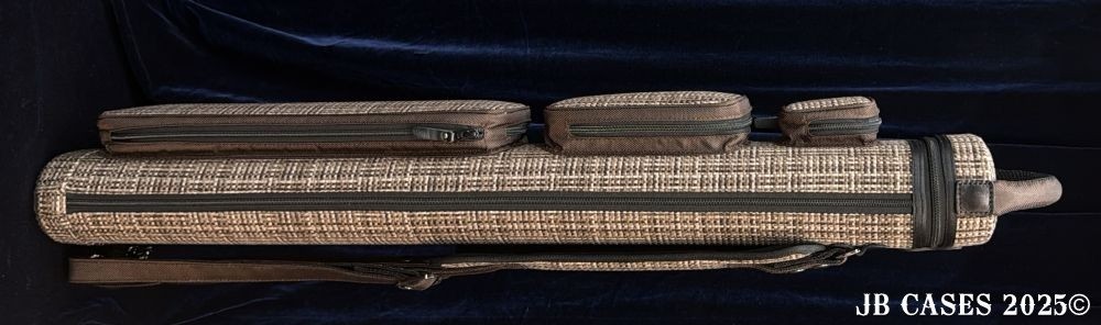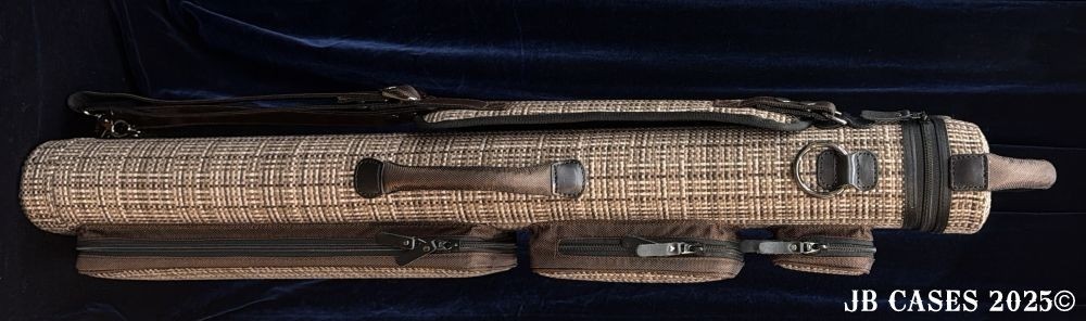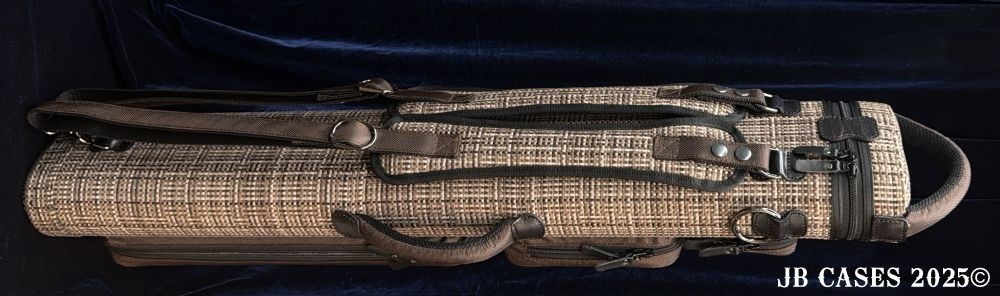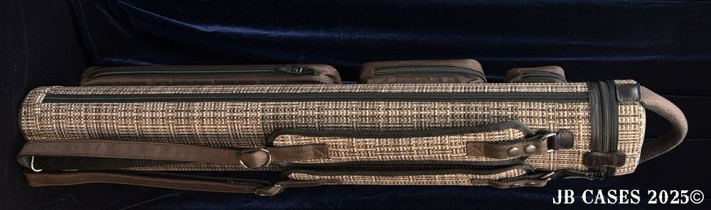 This case holds 4 butts and 8 shafts. Maximum interior length capacity is 32.5". This case is made of durable nylon/polyester material with reinforced leather stress points. Features an UltraPad interior, a heavy duty rubber bottom, a non-slip padded shoulder strap, and the highest quality zippers available. Each zipper has two pulls in case one should break. Three spacious pockets for easy access to your essentials. Includes Backpack Straps and a Towel Ring. Brown Tweed with Brown Nylon Pocket Sides and Handles. Brown Interior.
