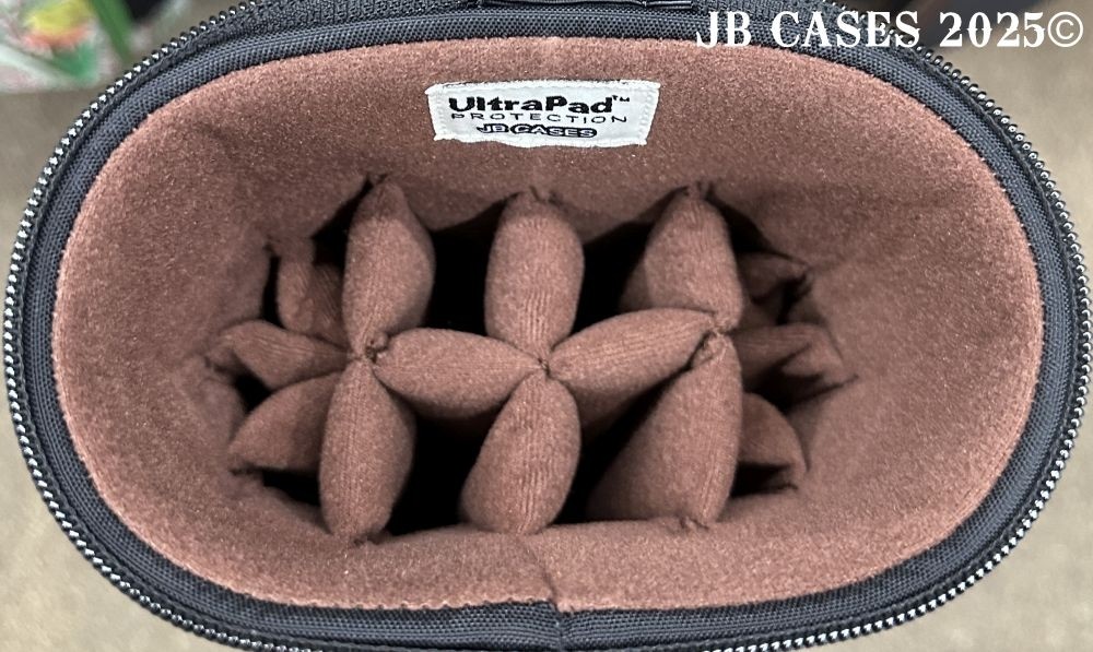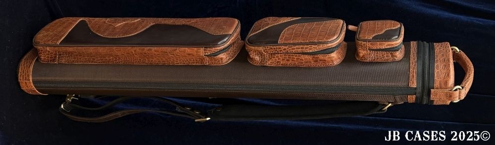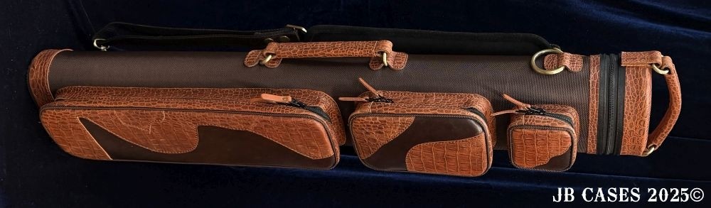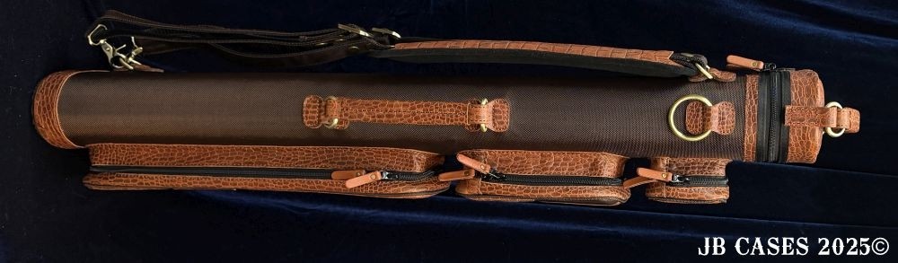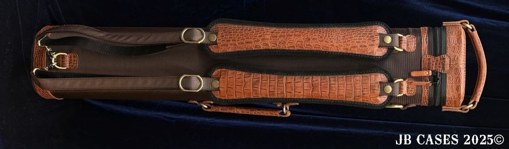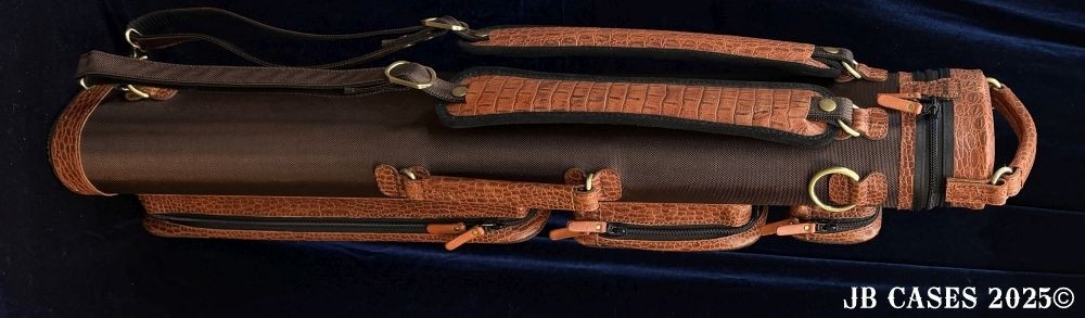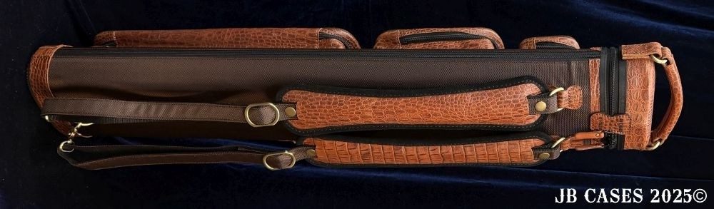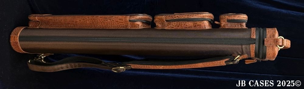 This rugged case holds up to 4 butts and 8 shafts. Maximum interior length capacity is 32.5". This case is a combination of embossed python print cowhide leather and durable brown nylon and polyester. Distinctions and Features: -Brown interior -Reinforced leather stress points -UltraPad Interior -Ergonomic top and side handles -Non-slip padded shoulder strap(s) -3 spacious pockets for easy access to your essentials -Backpack Straps -Towel Ring