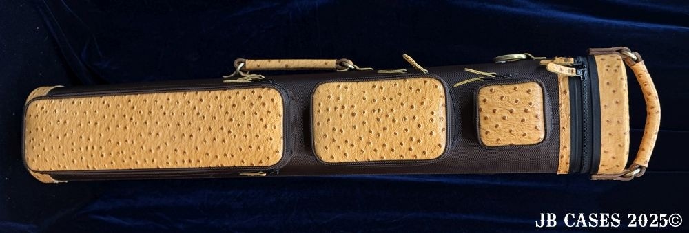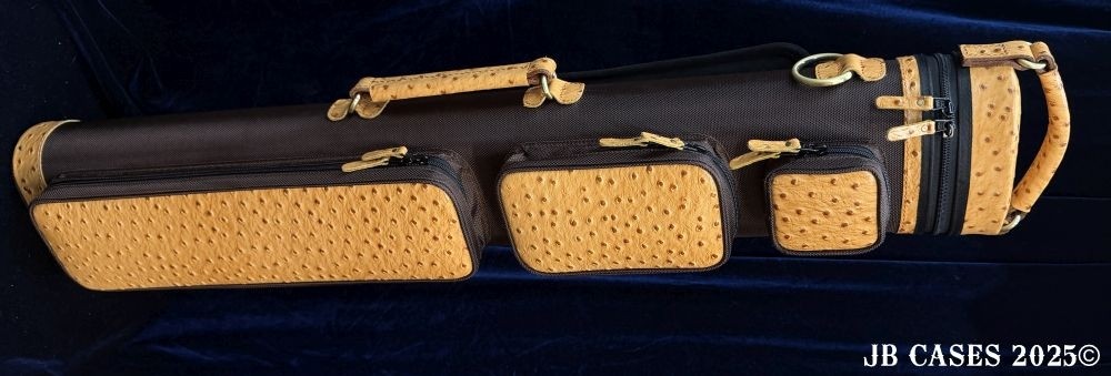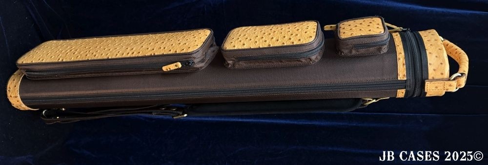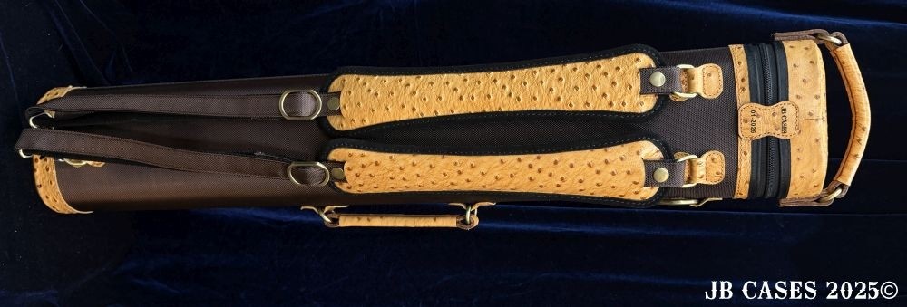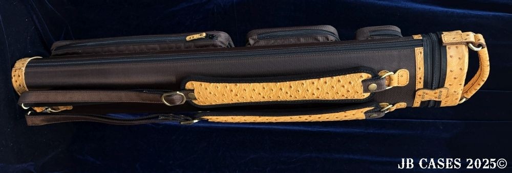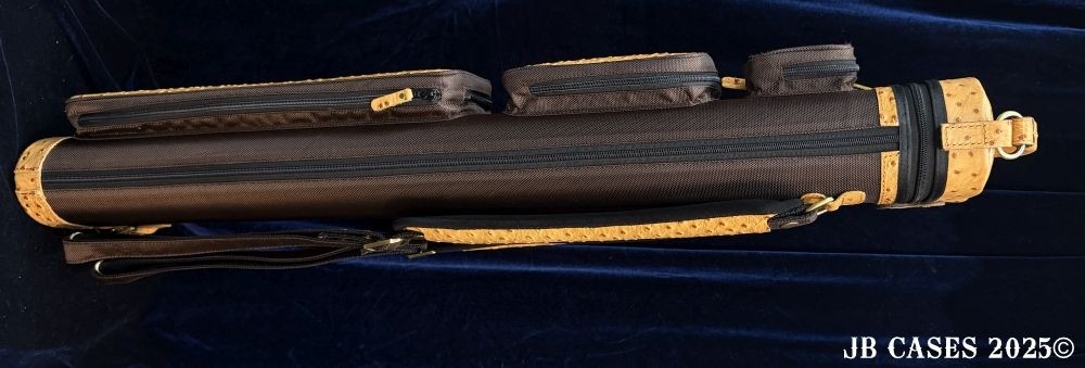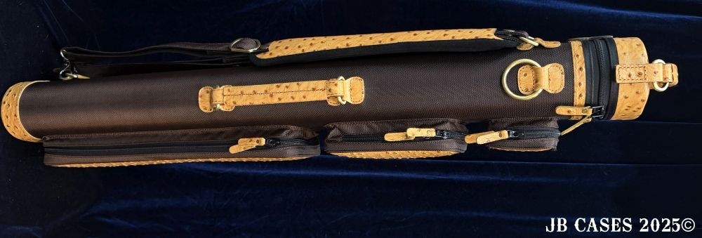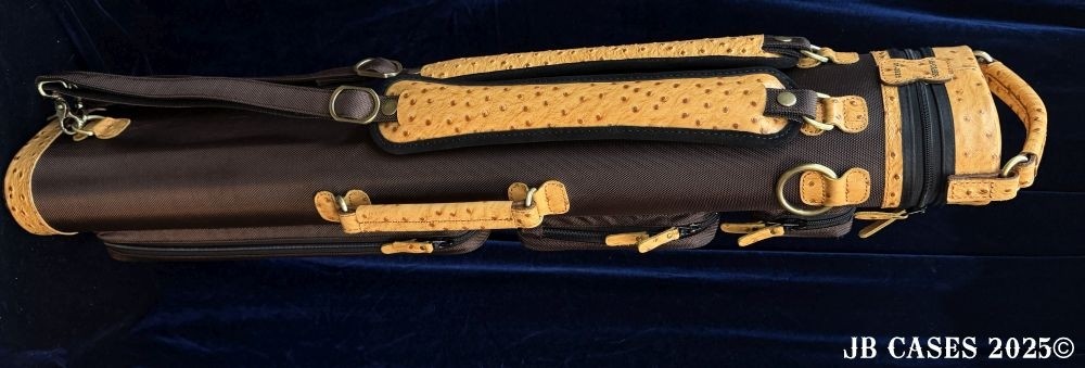 This rugged case holds up to 4 butts and 8 shafts. Maximum interior length capacity is 32.5". This case is a combination of embossed cowhide leather and durable nylon and polyester, with the body of the case in brown nylon. Distinctions and Features: -Brown interior -Reinforced leather stress points -UltraPad Interior -Ergonomic top and side handles -Non-slip padded shoulder strap(s) -3 spacious pockets for easy access to your essentials -Backpack Straps -Towel Ring