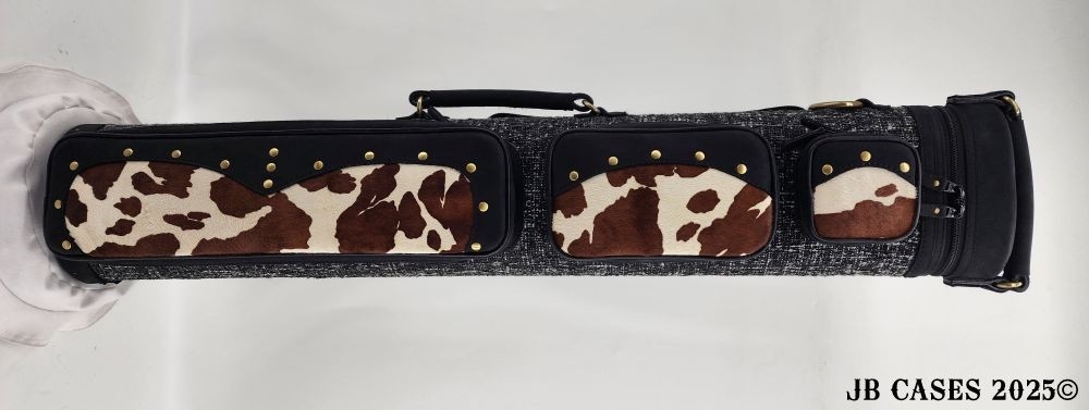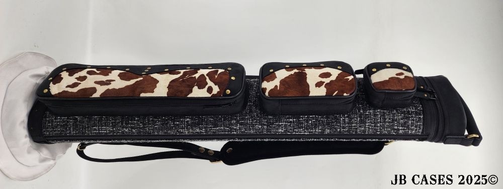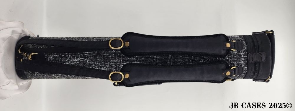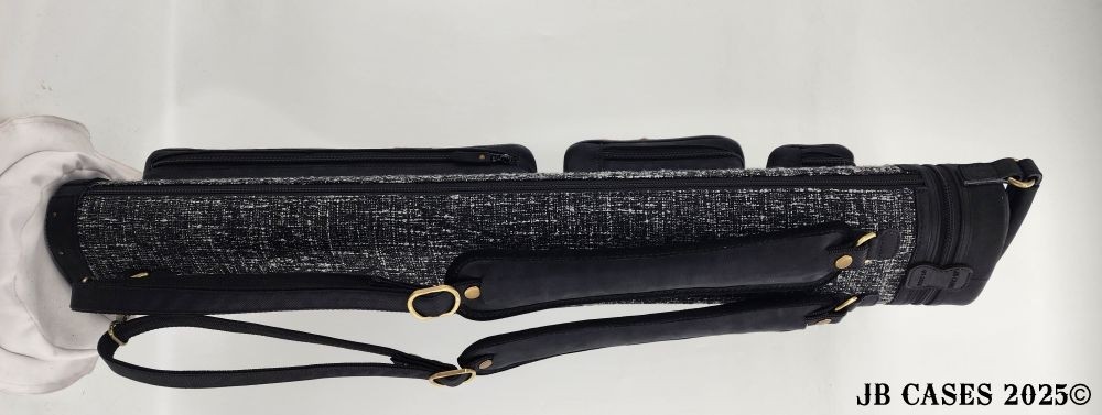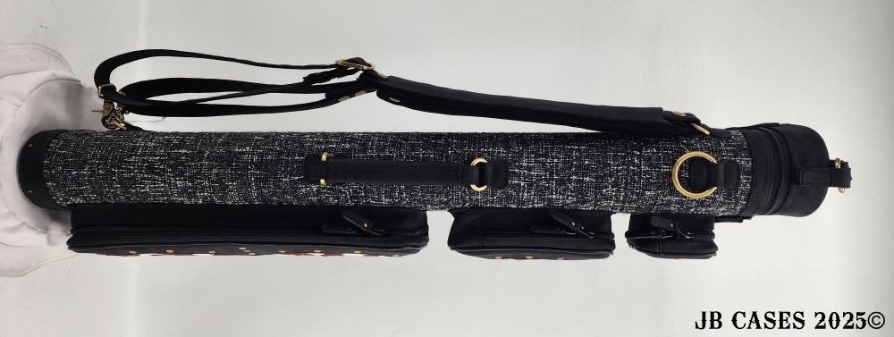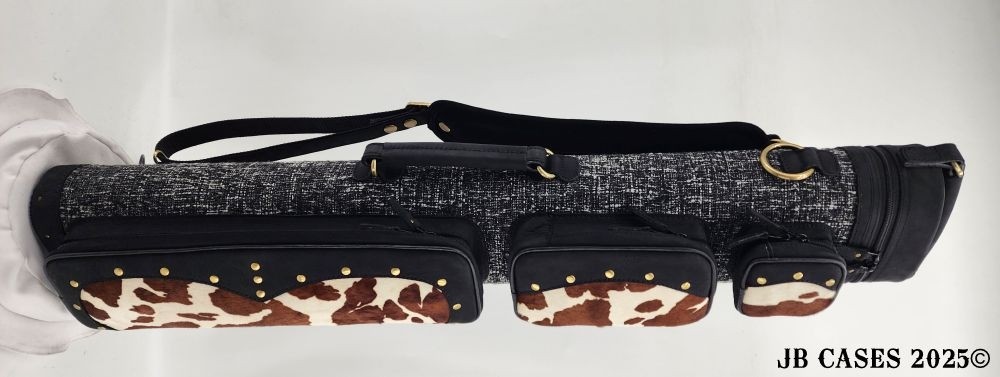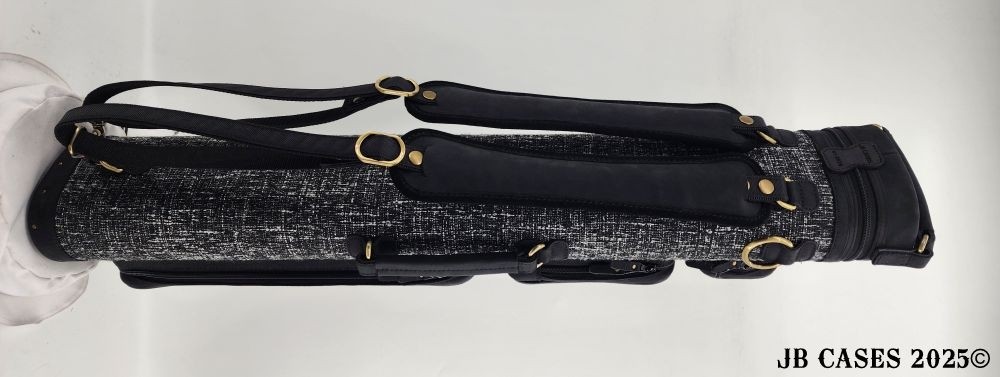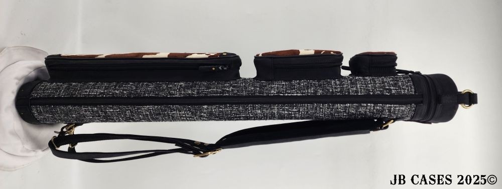 This rugged case holds up to 4 butts and 8 shafts. Maximum interior length capacity is 32.5". This case is a combination of cowhide leather with the body of the case in black and white tweed. Featuring black leather pieces attached to the pocket faces with brass rivets.