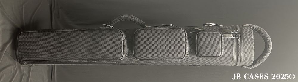This case holds 4 butts and 8 shafts. Maximum interior length capacity is 32.5". This case is made of durable carbon fiber textured nylon/polyester material with reinforced leather stress points. Features an UltraPad interior and very comfortable handles. Has a heavy duty rubber bottom. Featuring a non-slip well padded shoulder strap. Zippers are the highest quality available and each zipper has two pulls in case one should break. Three roomy pockets for easy access to your essentials.