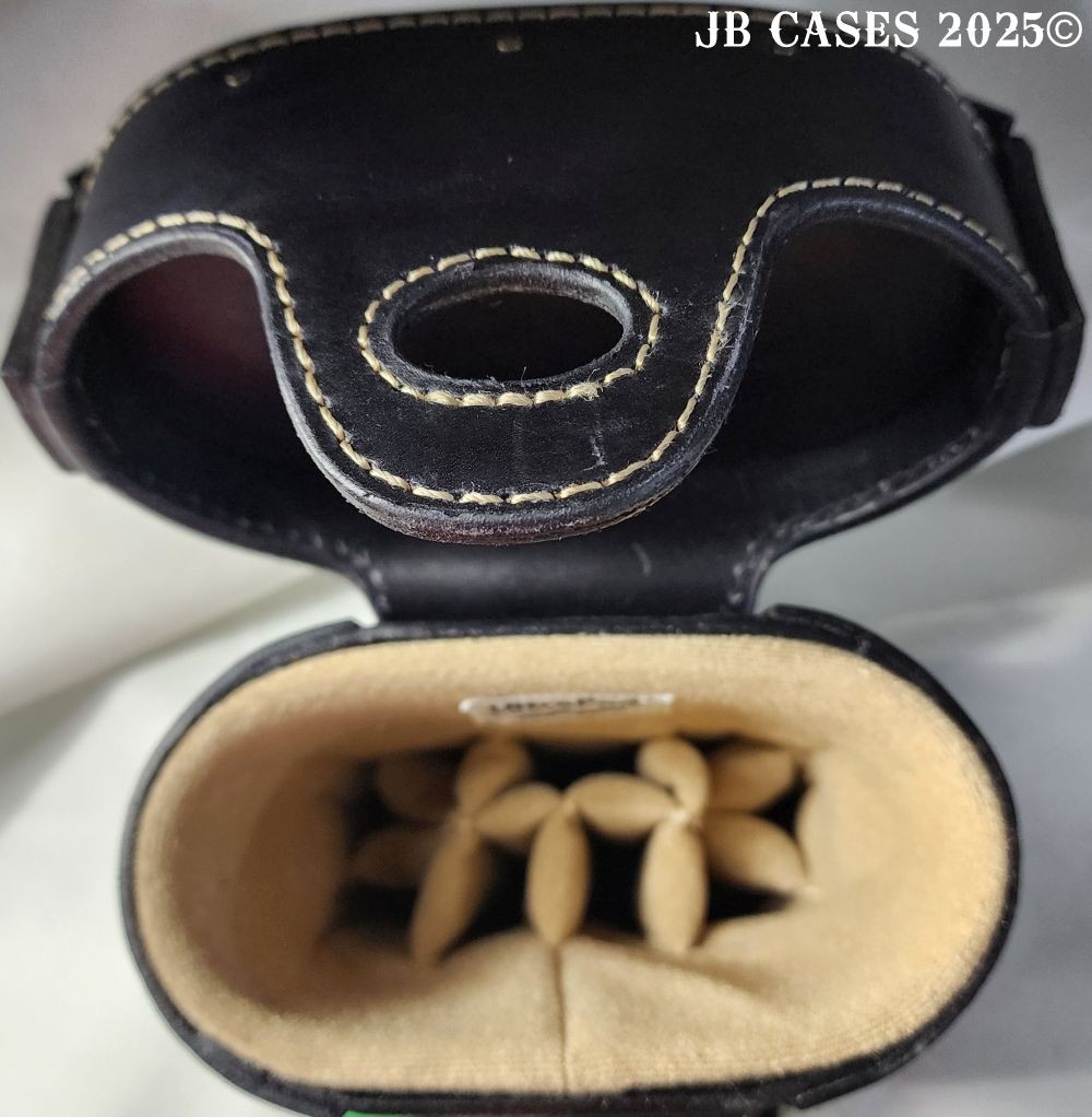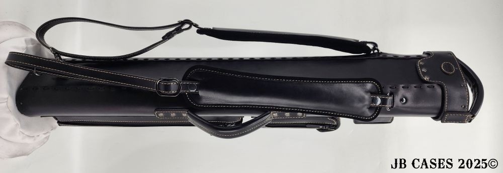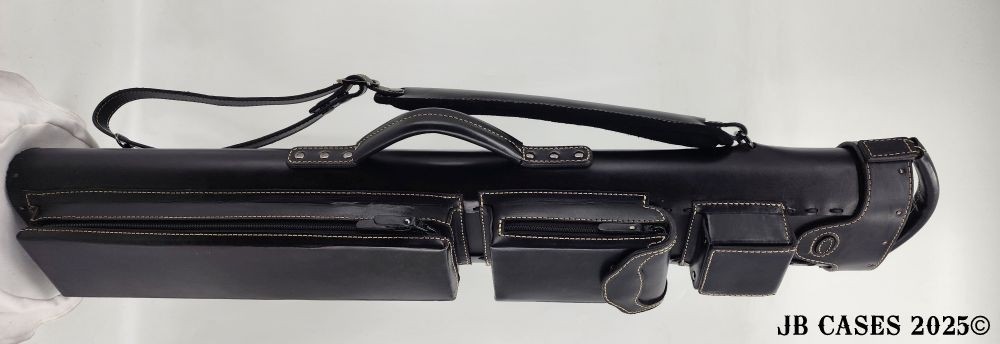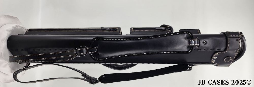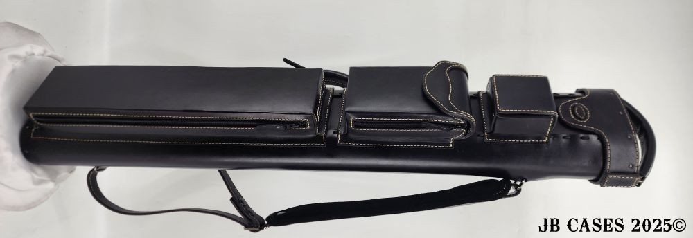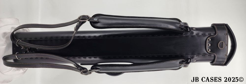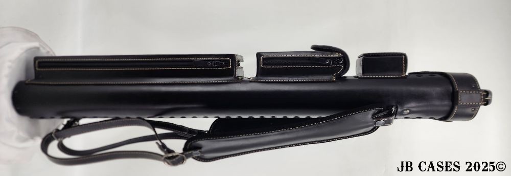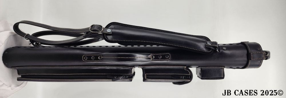 This beautiful black oil tan leather case holds 3 butts and 6 shafts. Maximum interior length capacity is 31.5". This case is made of durable black oil-tanned leather with tan stitching.