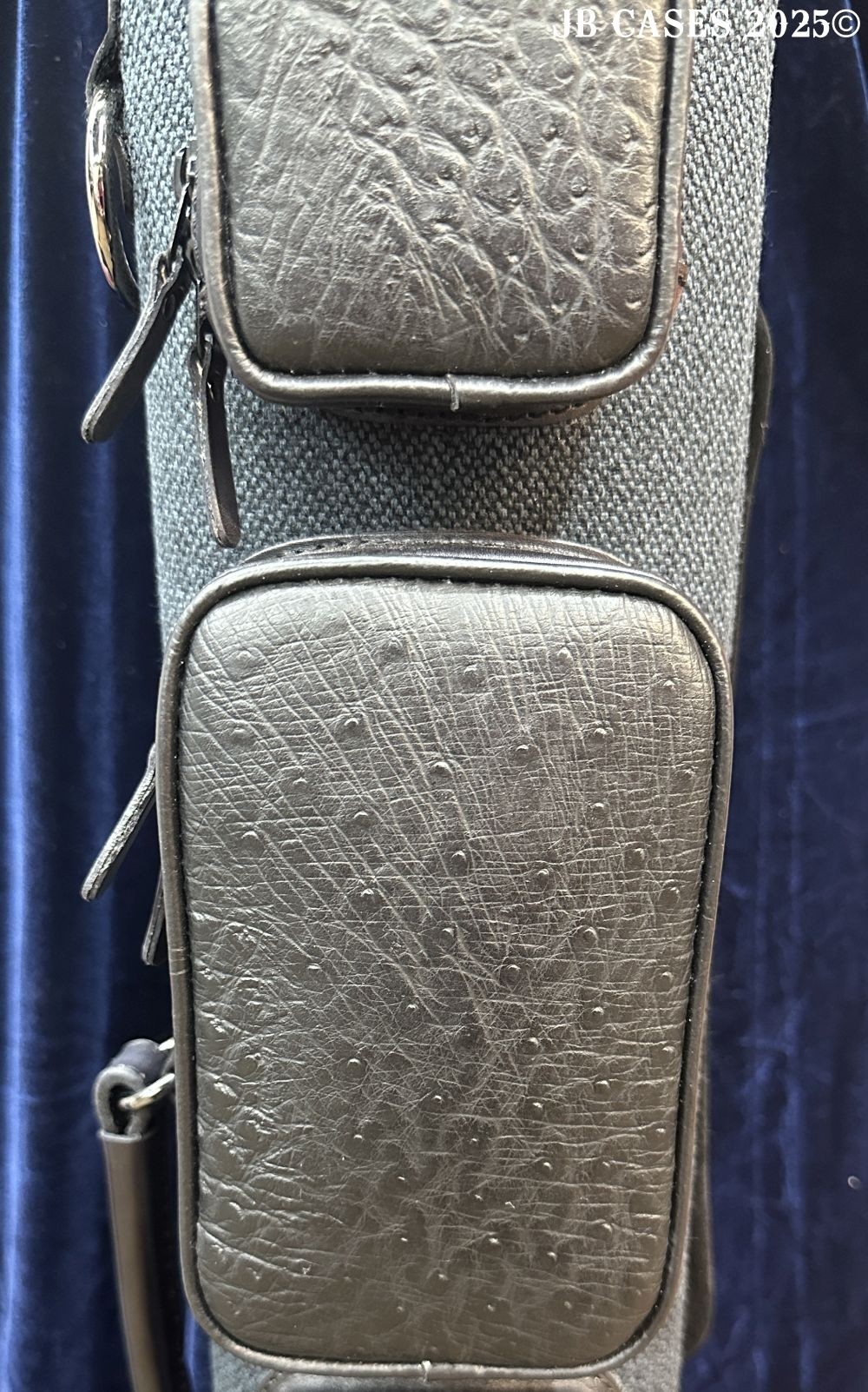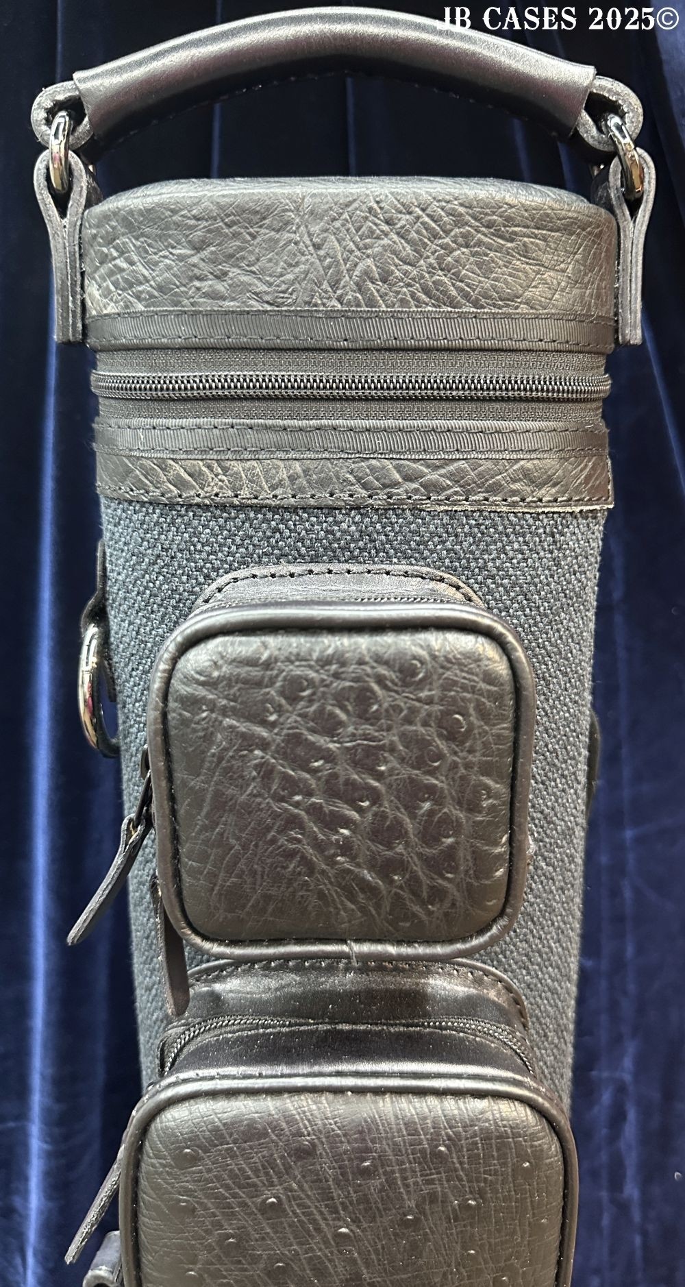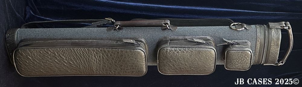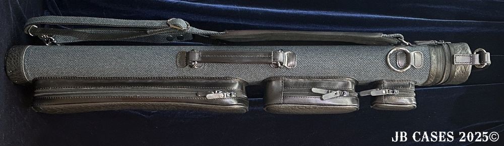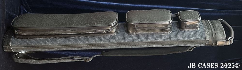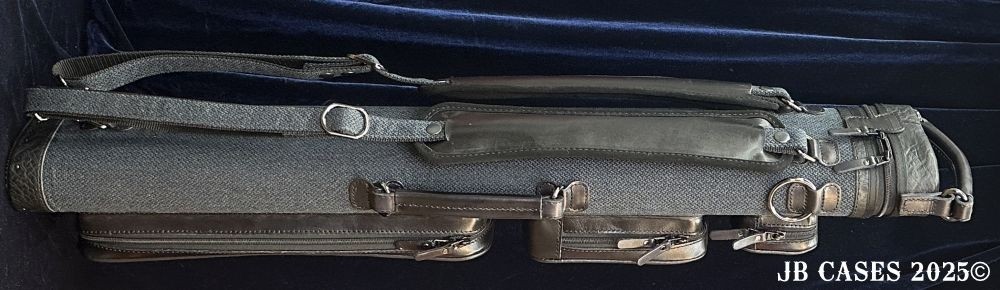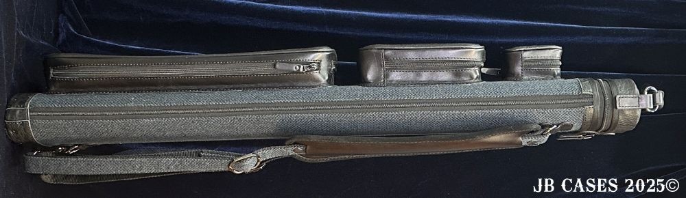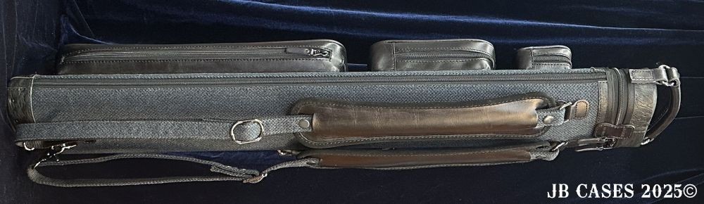 This case holds 3 butts and 6 shafts. Maximum interior length capacity is 32.5". This case is made of durable tweed material combined with high quality leather with reinforced leather stress points. Features an UltraPad interior and very comfortable leather handles. Has a heavy duty rubber bottom. Featuring a non-slip well padded shoulder strap. Zippers are the highest quality available and each zipper has two pulls in case one should break. Three roomy pockets for easy access to your essentials.