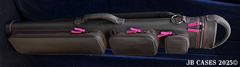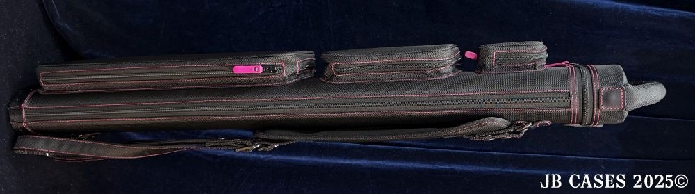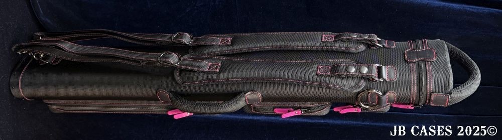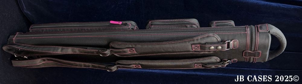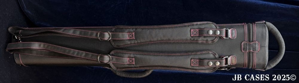 This case holds 2 butts and 5 shafts or 3 butts and 4 shafts. Maximum interior length capacity is 32.5". This case is made of durable nylon/polyester material with reinforced leather stress points. Features an UltraPad interior and very comfortable handles. Has a heavy duty rubber bottom. Featuring non-slip well padded backpack shoulder straps. Zippers are the highest quality available and each zipper has two pulls in case one should break. Three roomy pockets for easy access to your essentials.