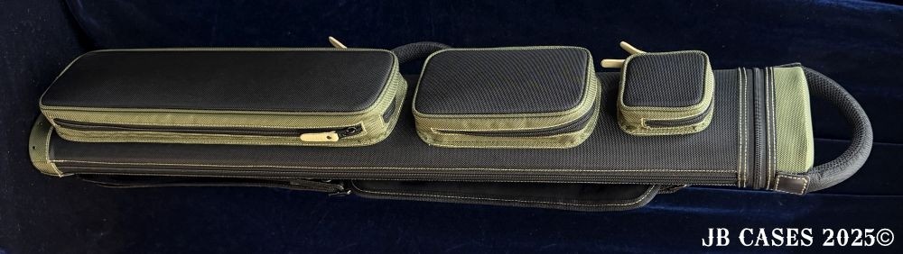 This case holds 3 butts and 6 shafts. Maximum interior length capacity is 32.5". This case is made of durable nylon/polyester material with reinforced leather stress points. Features an UltraPad interior, comfortable handles, a heavy duty rubber bottom, and non-slip padded Backpack straps. Towel Ring. Tan Interior.