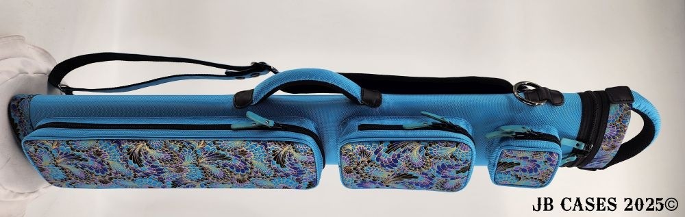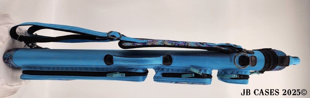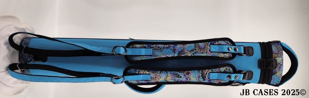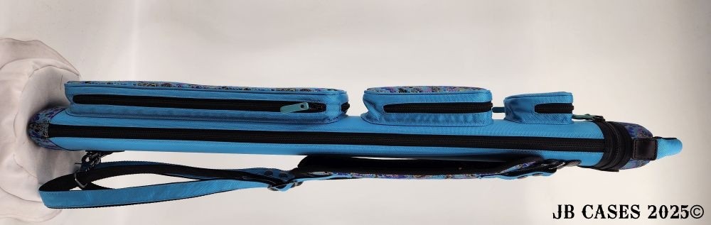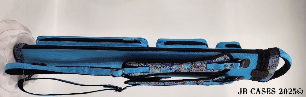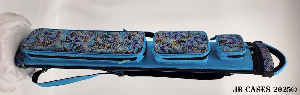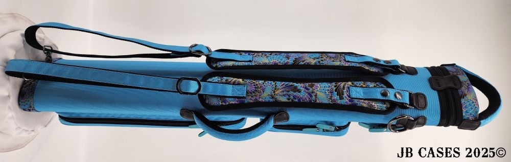 This rugged case holds up to 3 butts and 6 shafts. Maximum interior length capacity is 32.5". This case is made of durable nylon and polyester, and Shiny Gold, Teal, and Purple Peacock Print Fabric. Teal Zipper Pulls and Pocket Sides