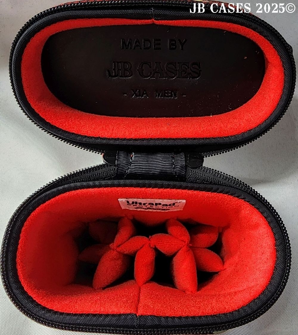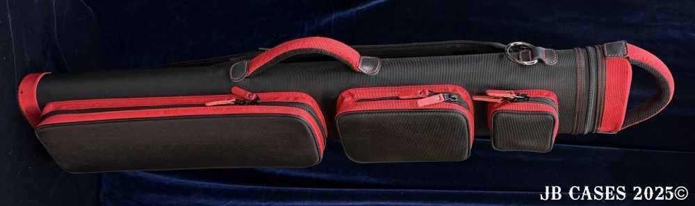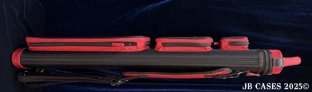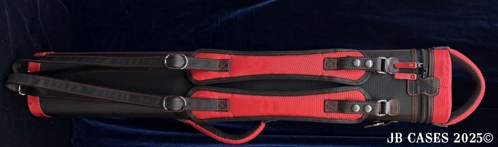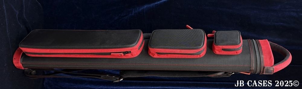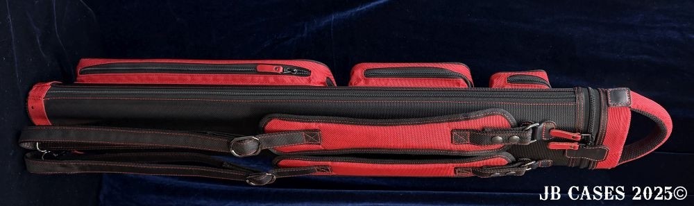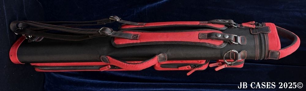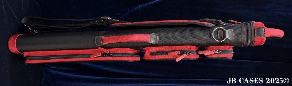 This case holds 3 butts and 6 shafts. Maximum interior length capacity is 32.5". This case is made of durable nylon/polyester material with reinforced leather stress points. Features an UltraPad interior, comfortable handles, a heavy duty rubber bottom, and a non-slip padded shoulder strap. Zippers are the highest quality available and each zipper has two pulls in case one should break. Three spacious pockets for easy access to your essentials, as well as backpack-style padded straps. Towel Ring. Black with Red Accents. Red Interior.