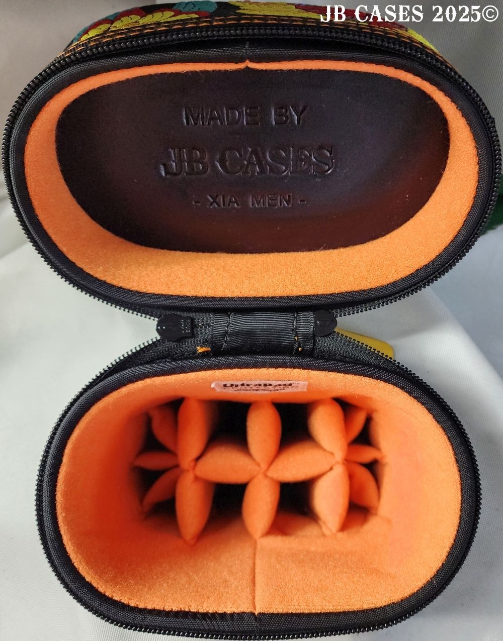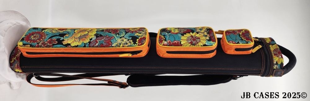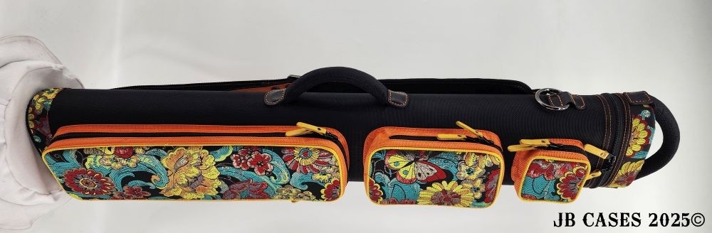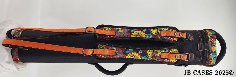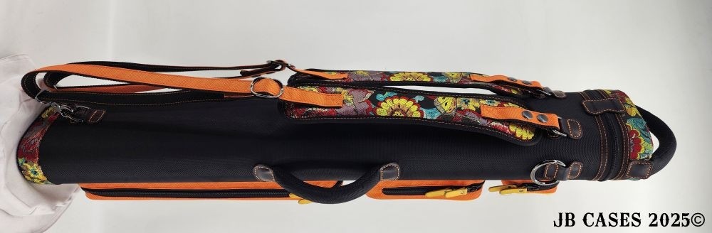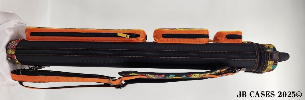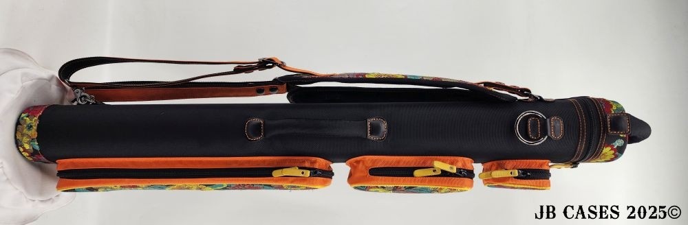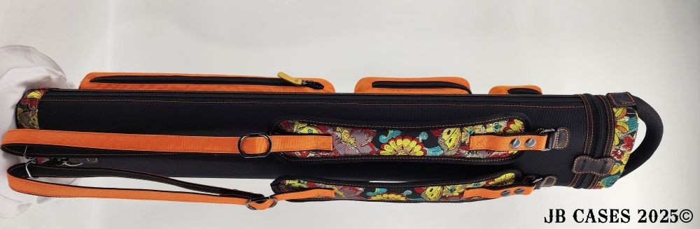 This case holds 4 butts and 8 shafts. Maximum interior length capacity is 32.5". This case is made of durable nylon/polyester material with reinforced leather stress points. Features an UltraPad interior and very comfortable handles. Has a heavy duty rubber bottom. Featuring non-slip well padded backpack straps. Zippers are the highest quality available and each zipper has two pulls in case one should break. Three roomy pockets for easy access to your essentials. Towel Ring. This Ultimate Rugged case is made with Metallic Floral Pattern Fabric accents. Black Nylon Body and Handles. Yellow Piping and Zipper Pulls. Safety Orange Pocket Sides, Stitching and Interior.